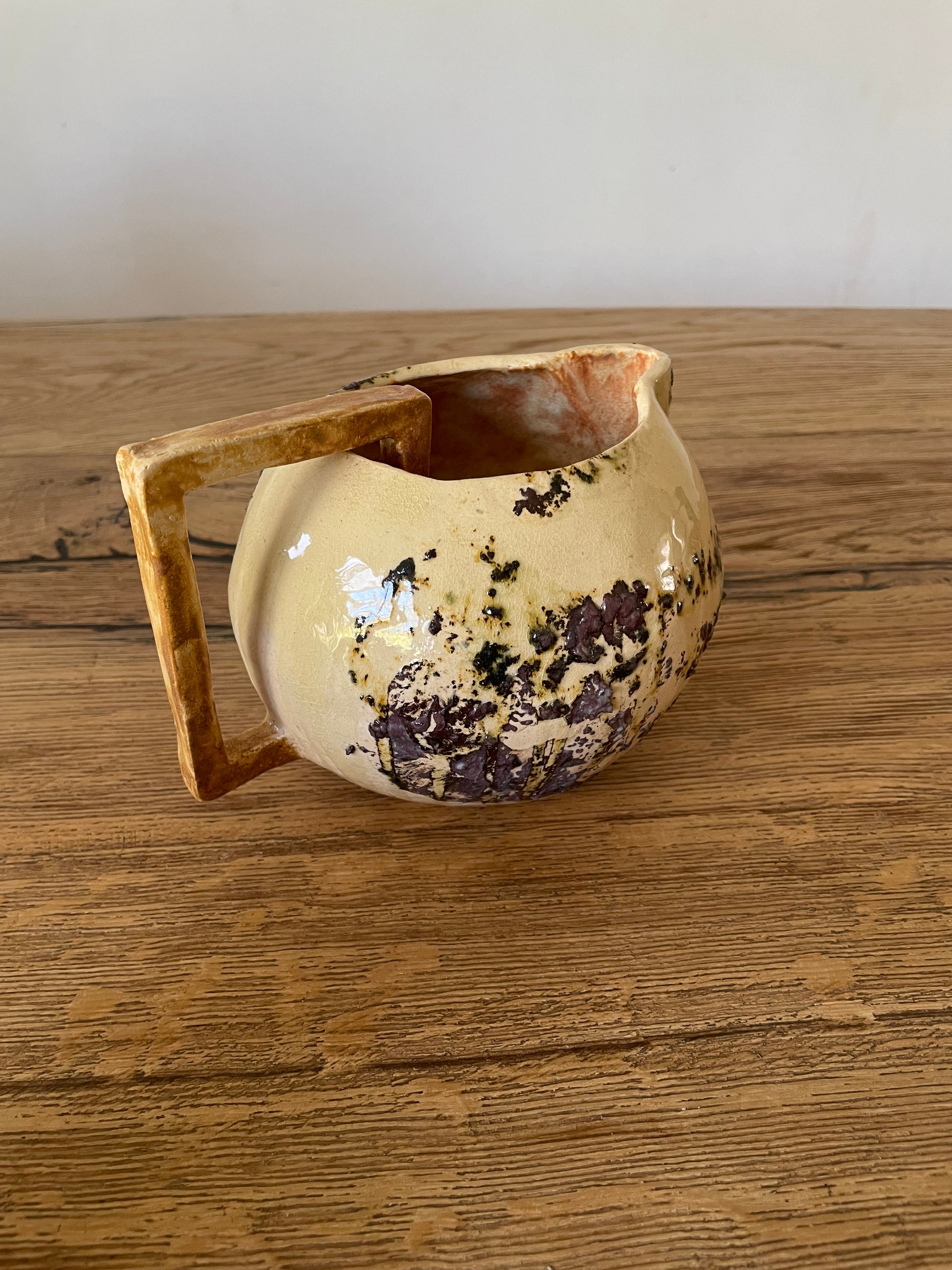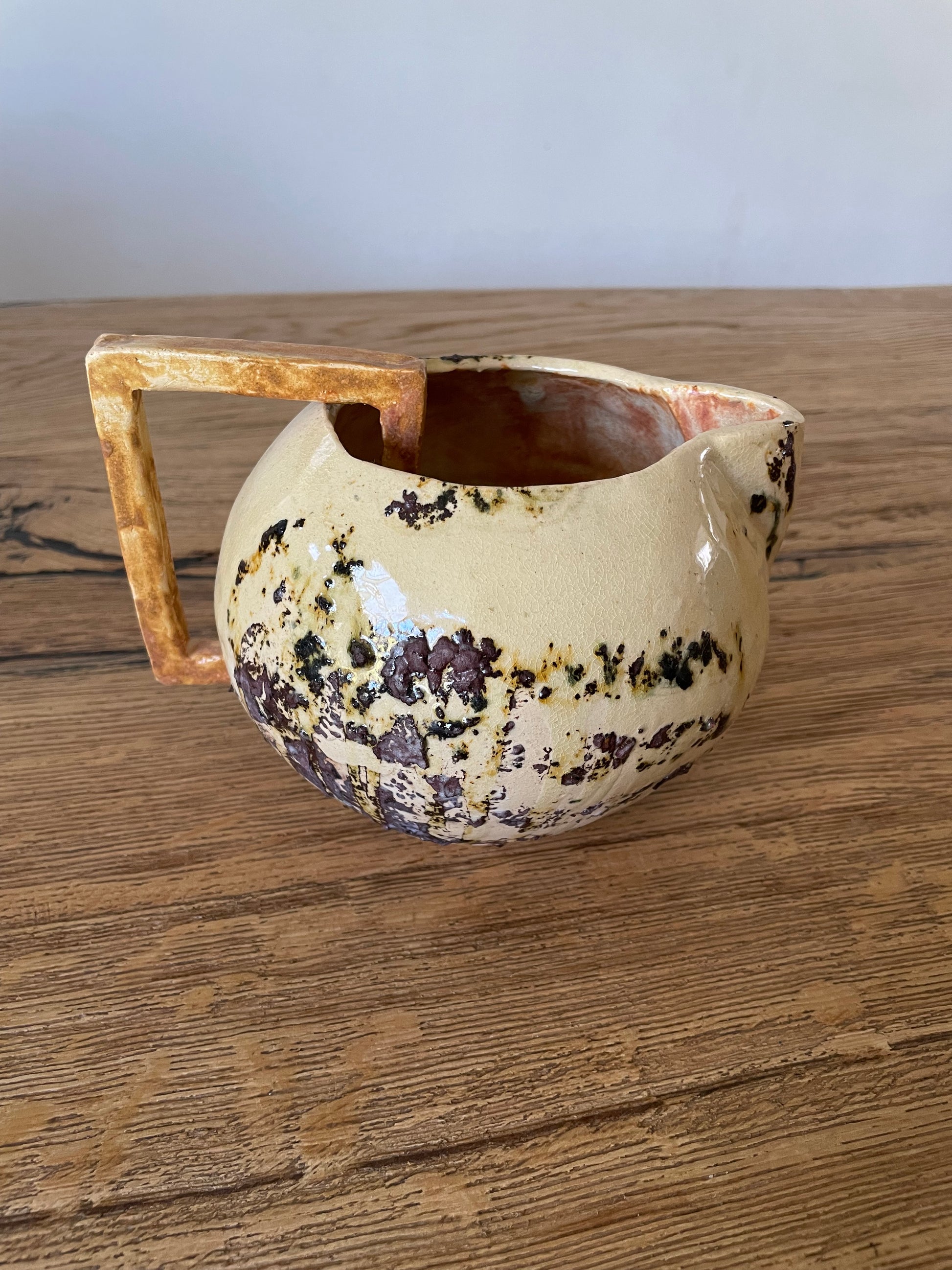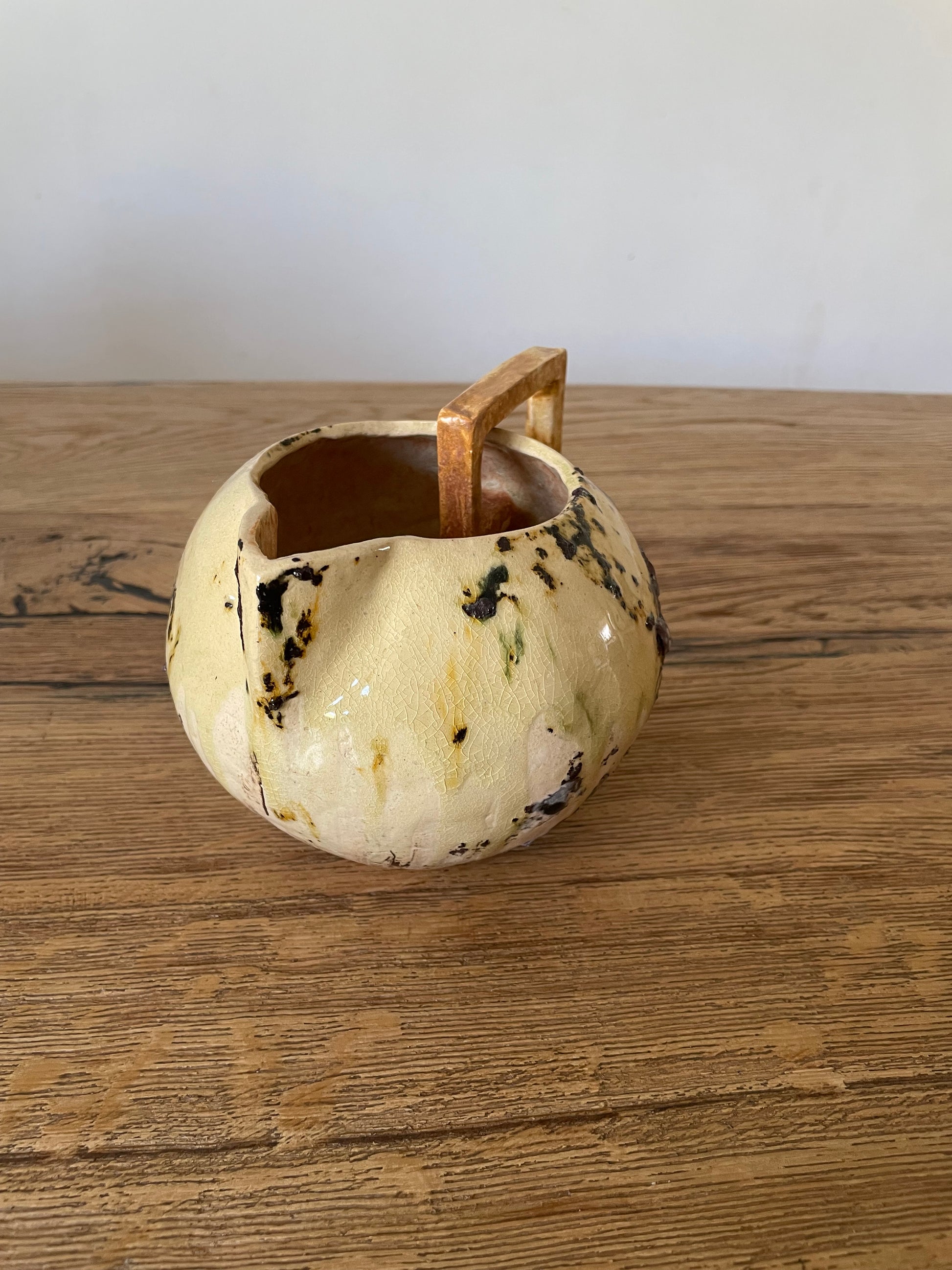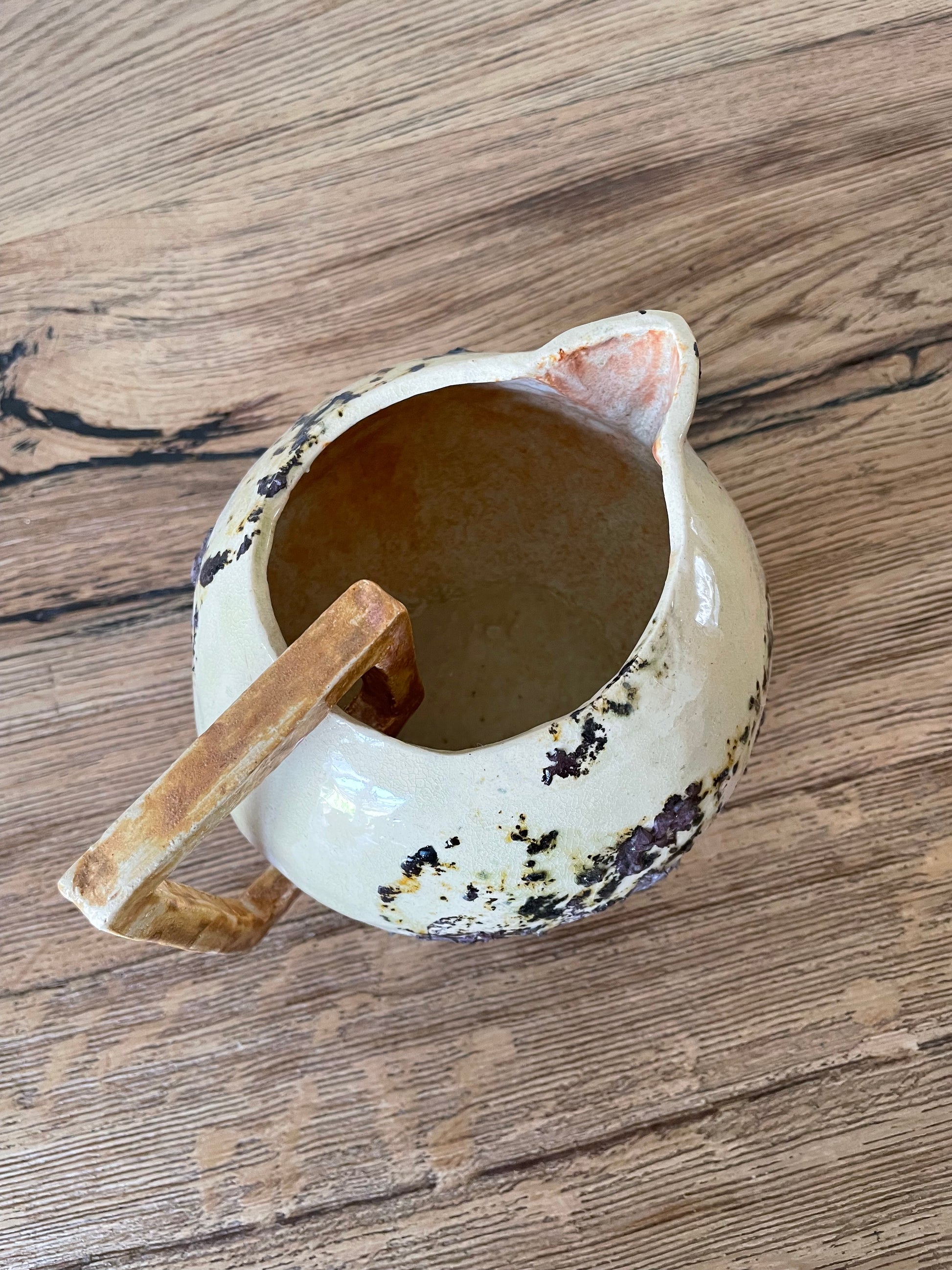 Handgevormde karaf van witte klei, geglazuurd met een combinatie van honing glazuur en aan weerszijde een handafdruk van ijzerhoudende oxides.