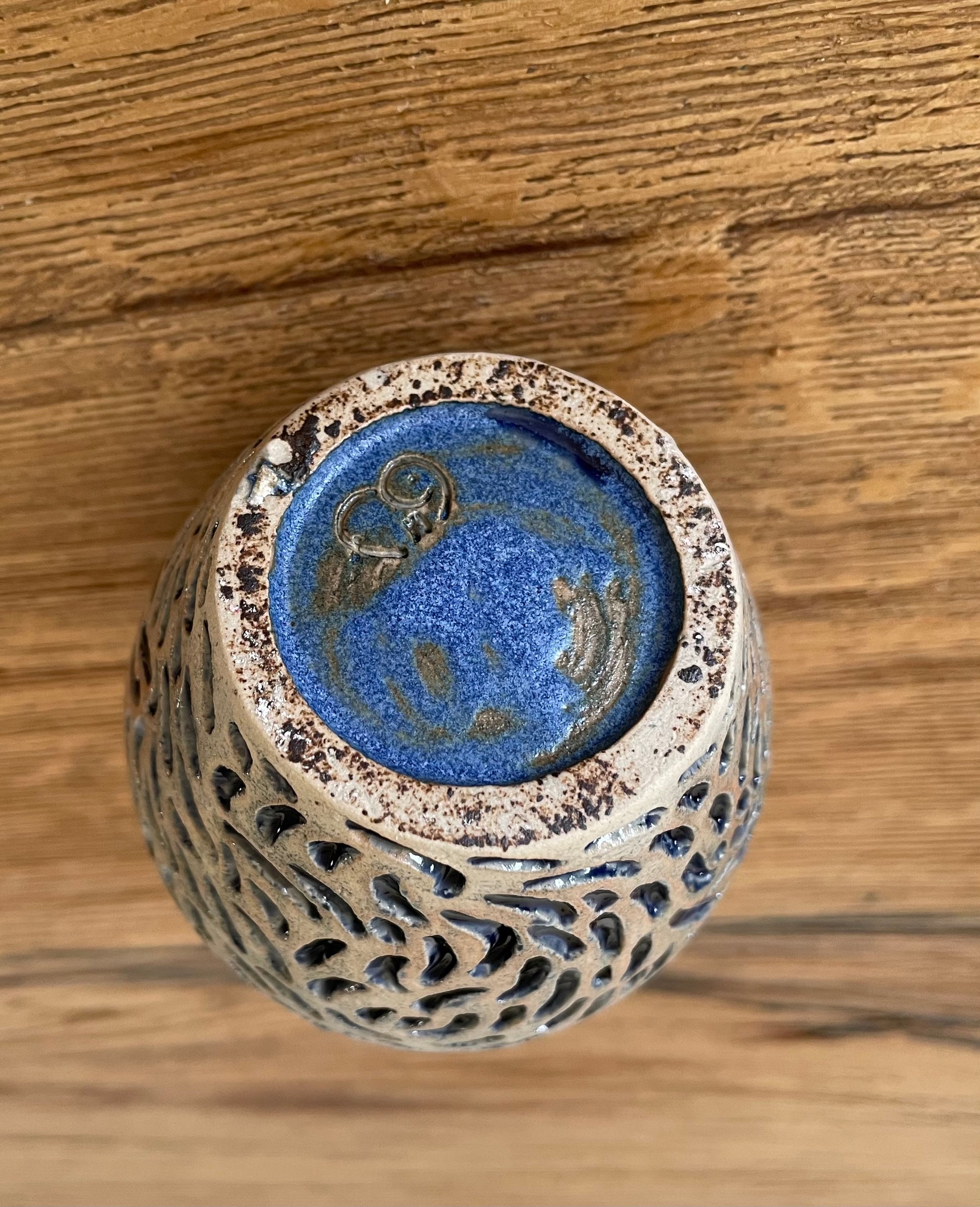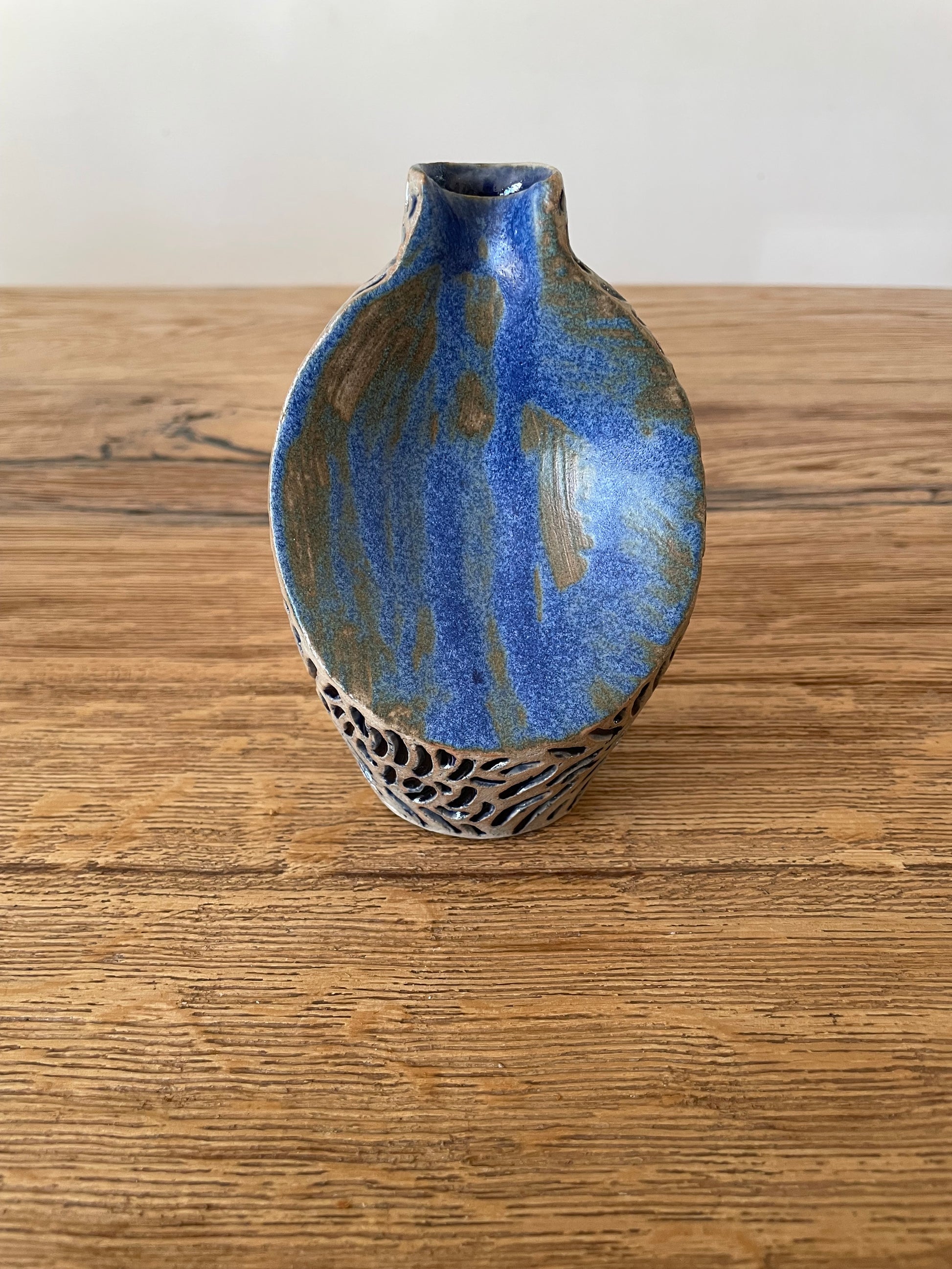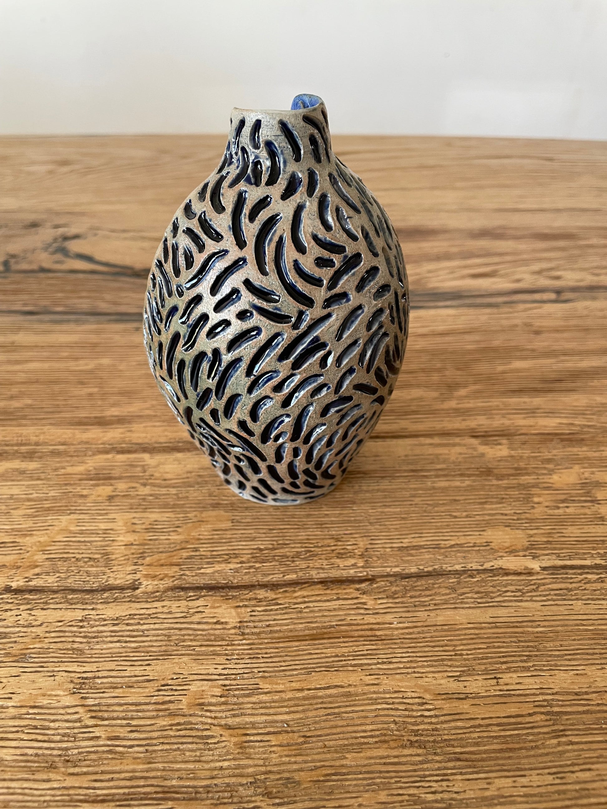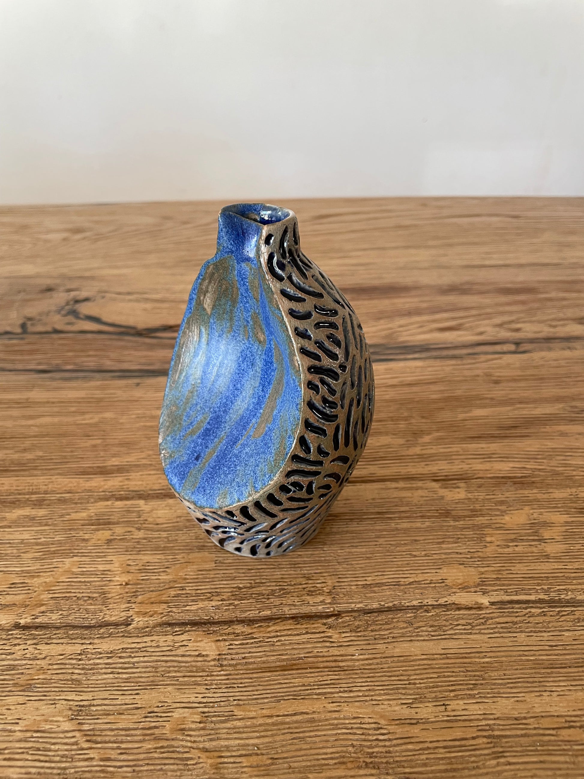 Kleine gedraaide vaas met uitgesneden en omgedraaid vlak. De vaas is voorzien van uitsparingen in een patroon die gevuld zijn met een diep blauwe glazuur.