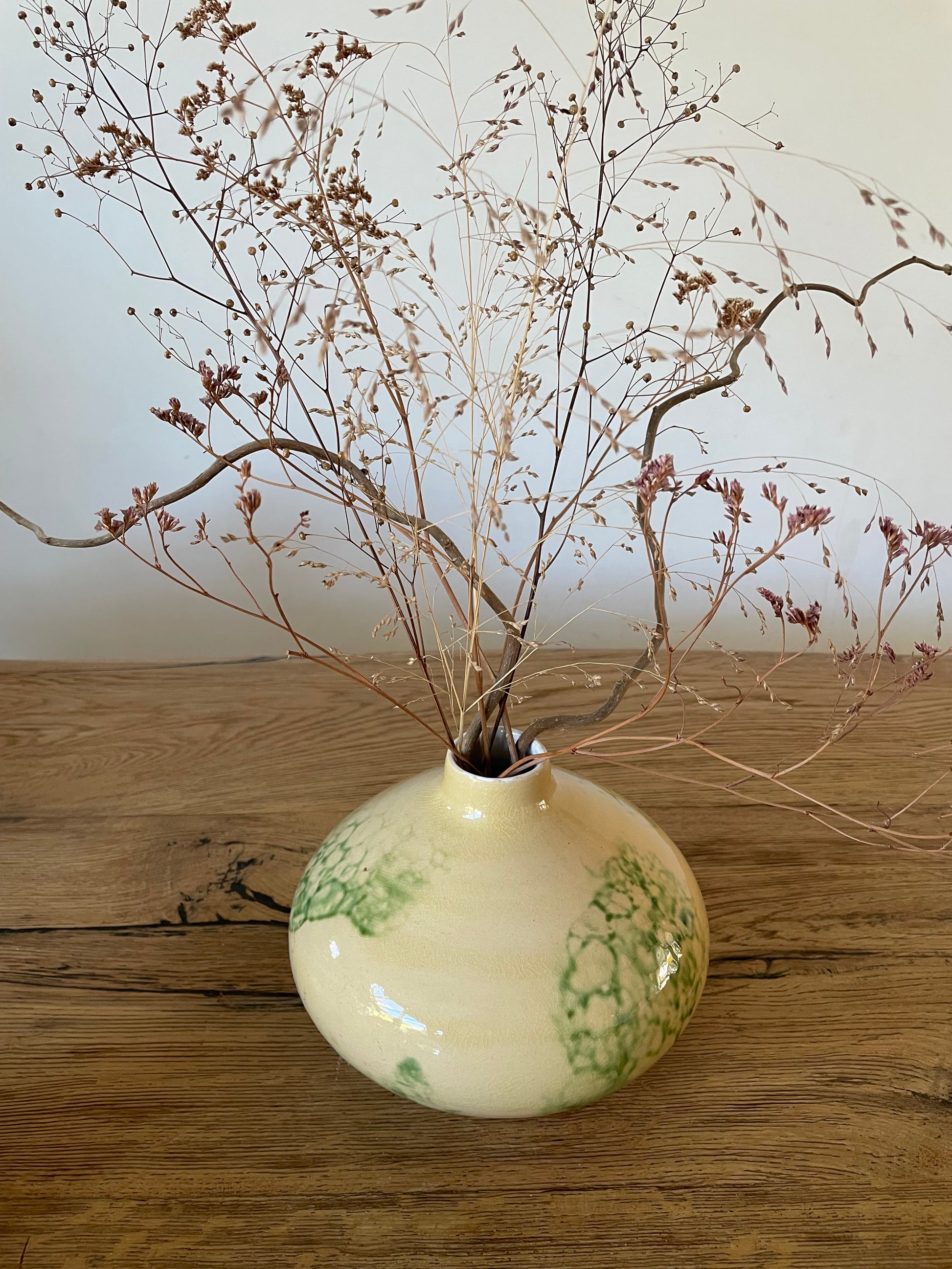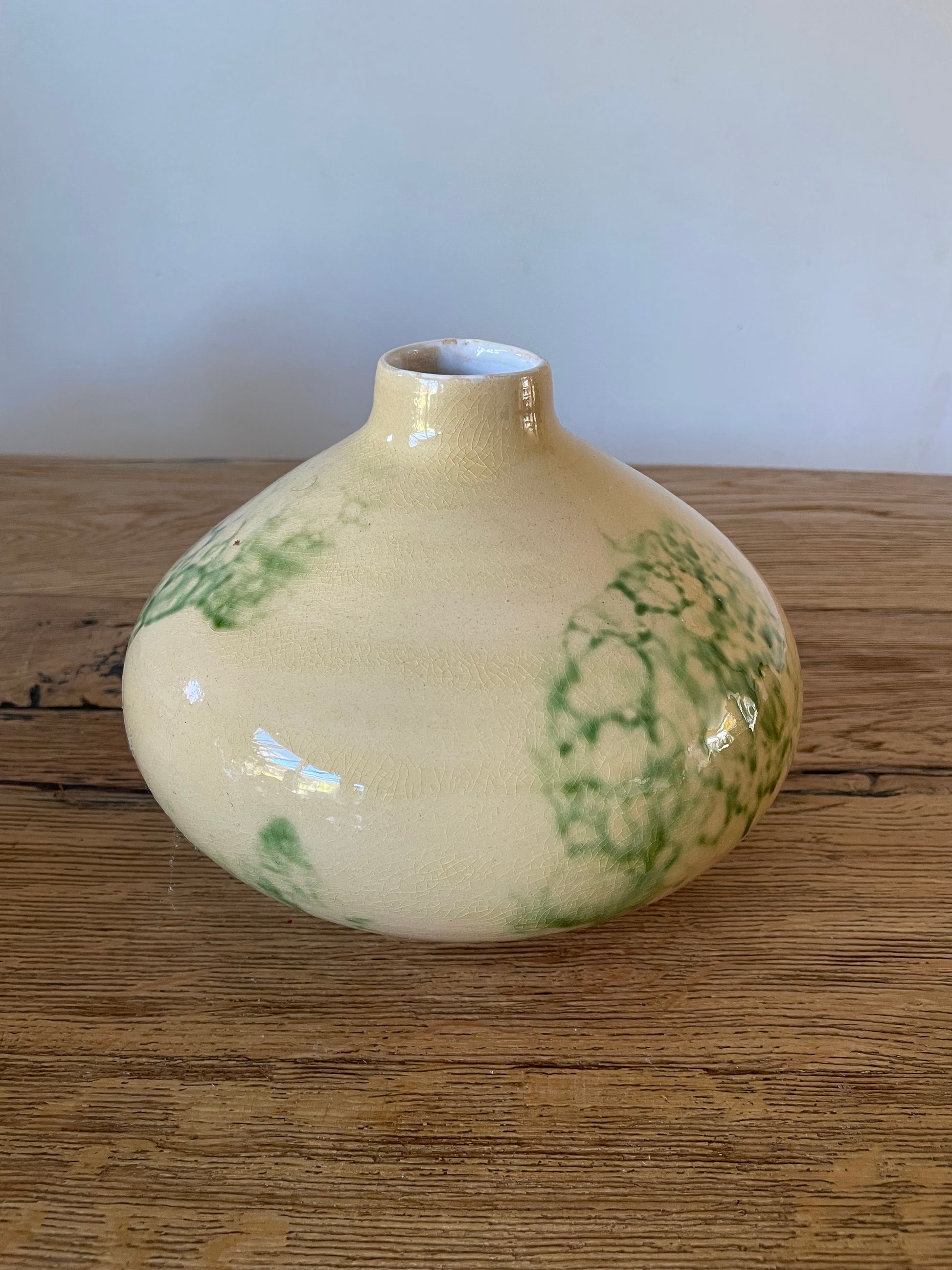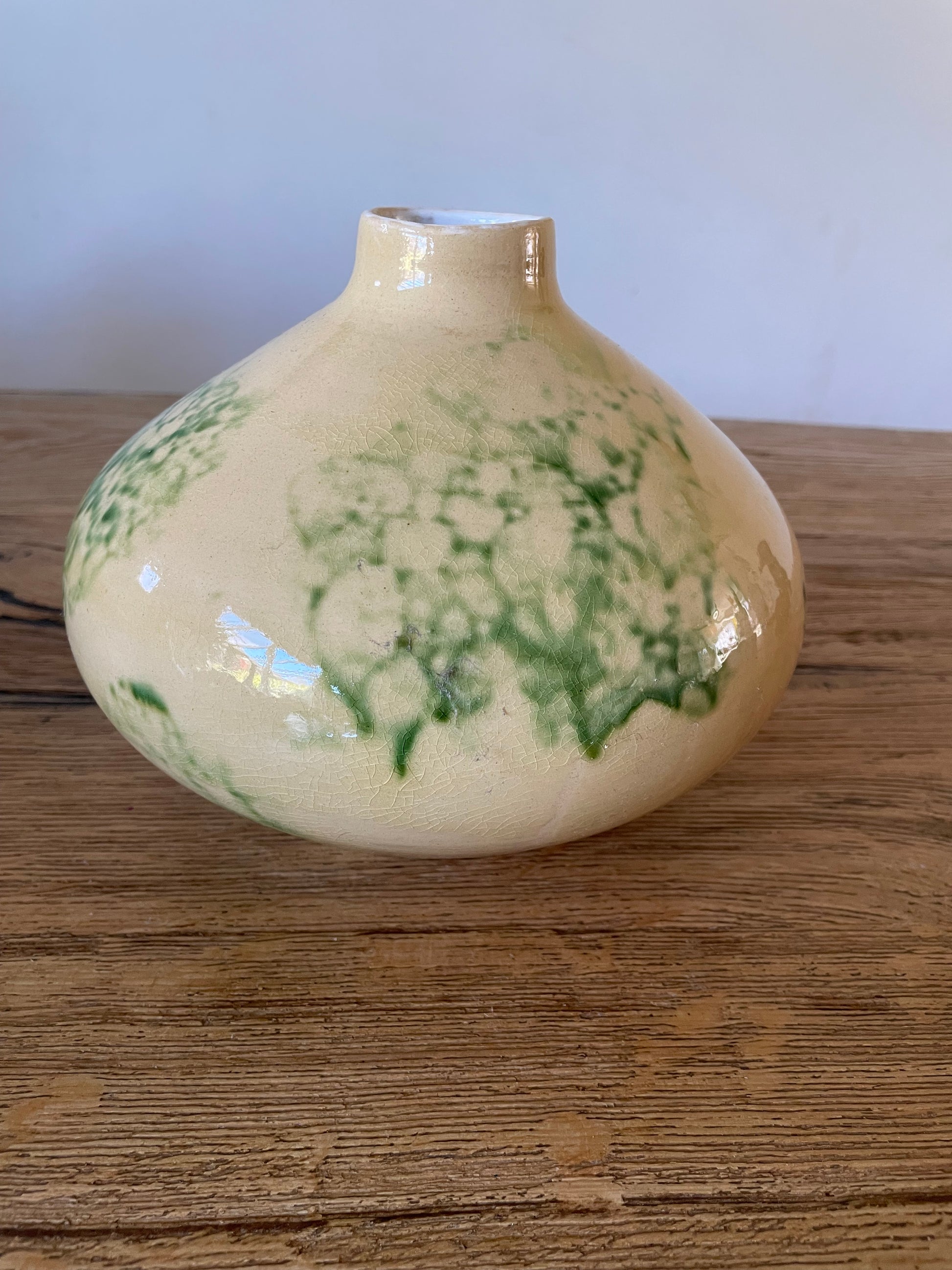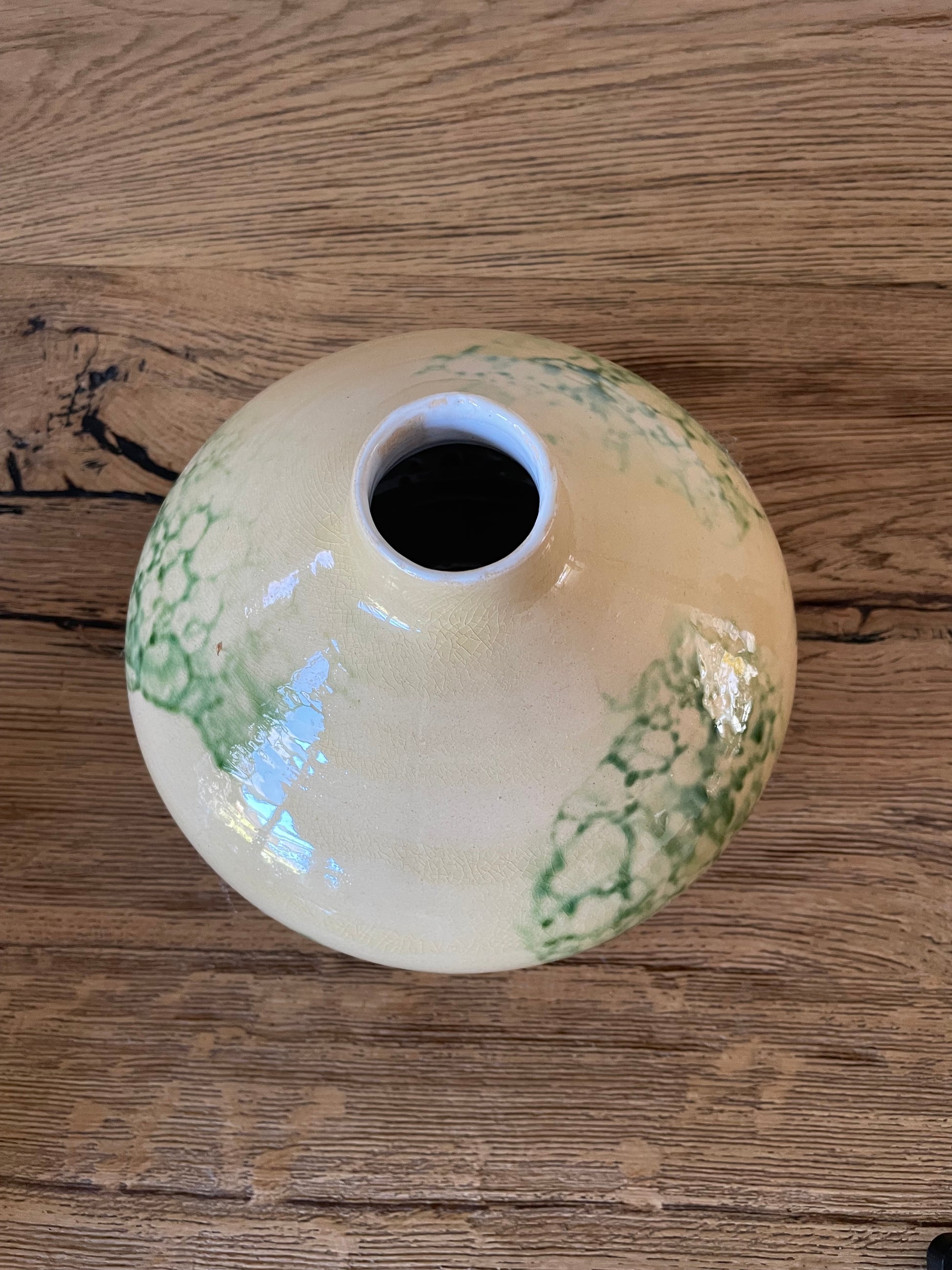 Gedraaide Moonjar van witte klei, voorzien van groen en honing glazuur. Het groene glazuur is aangebracht doormiddel van de bellenblaas techniek dit geeft de ronde vormen en een gelaagdheid aan het glazuur.