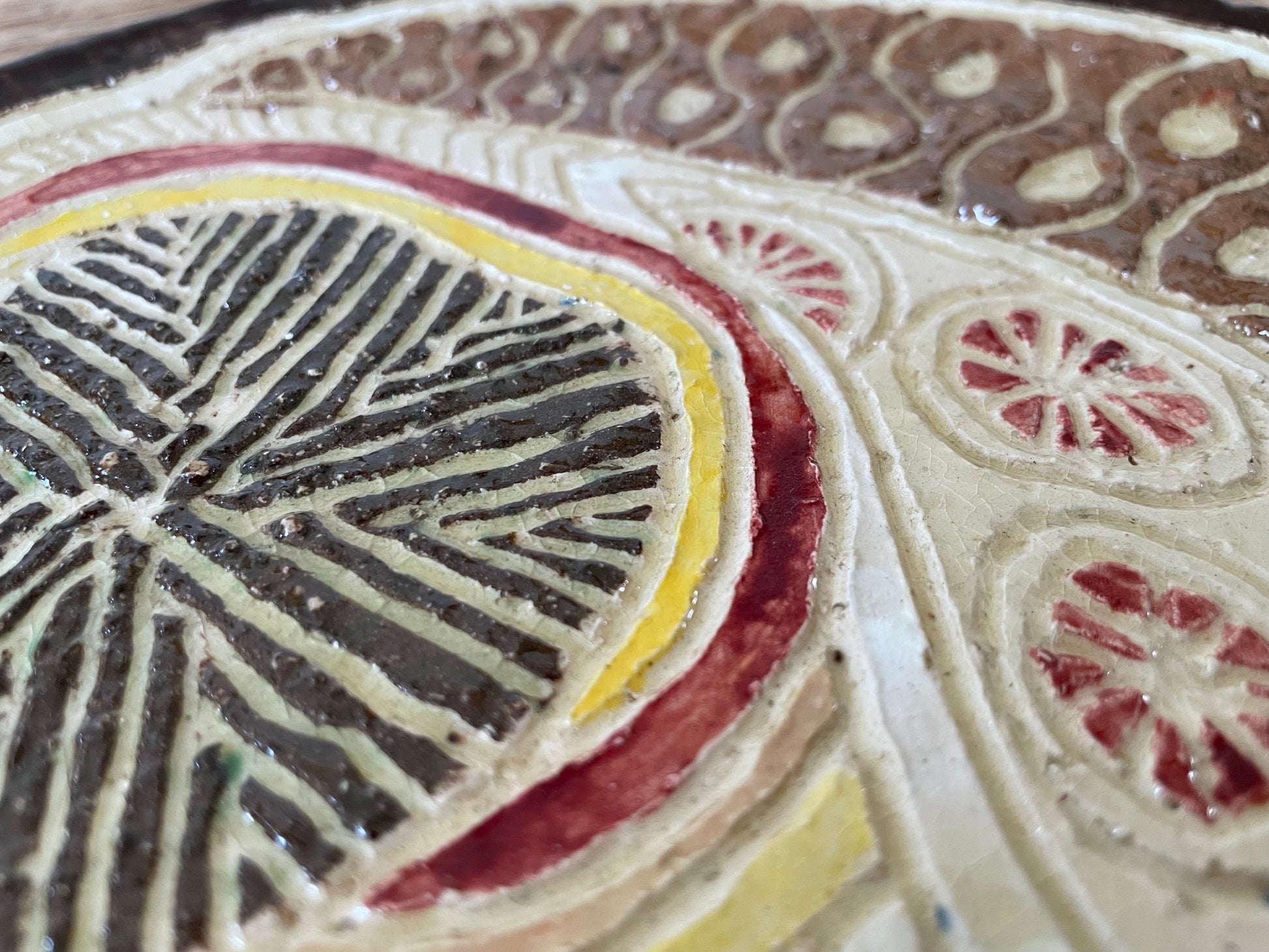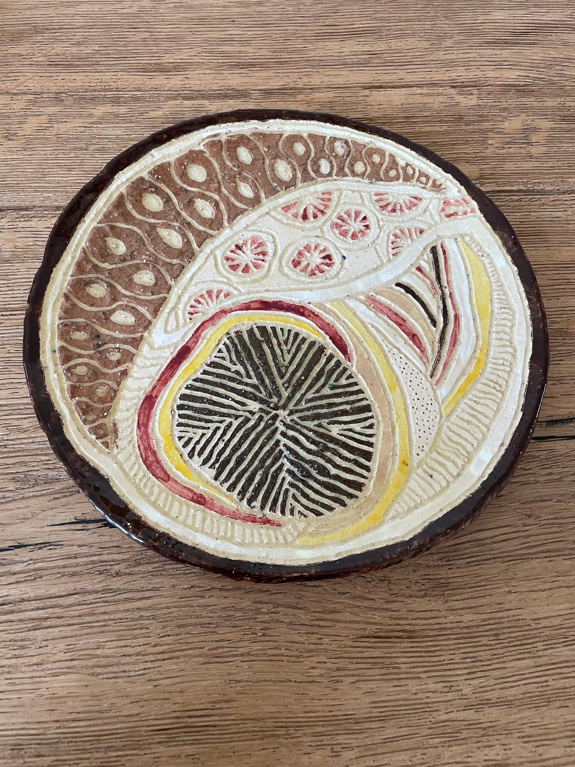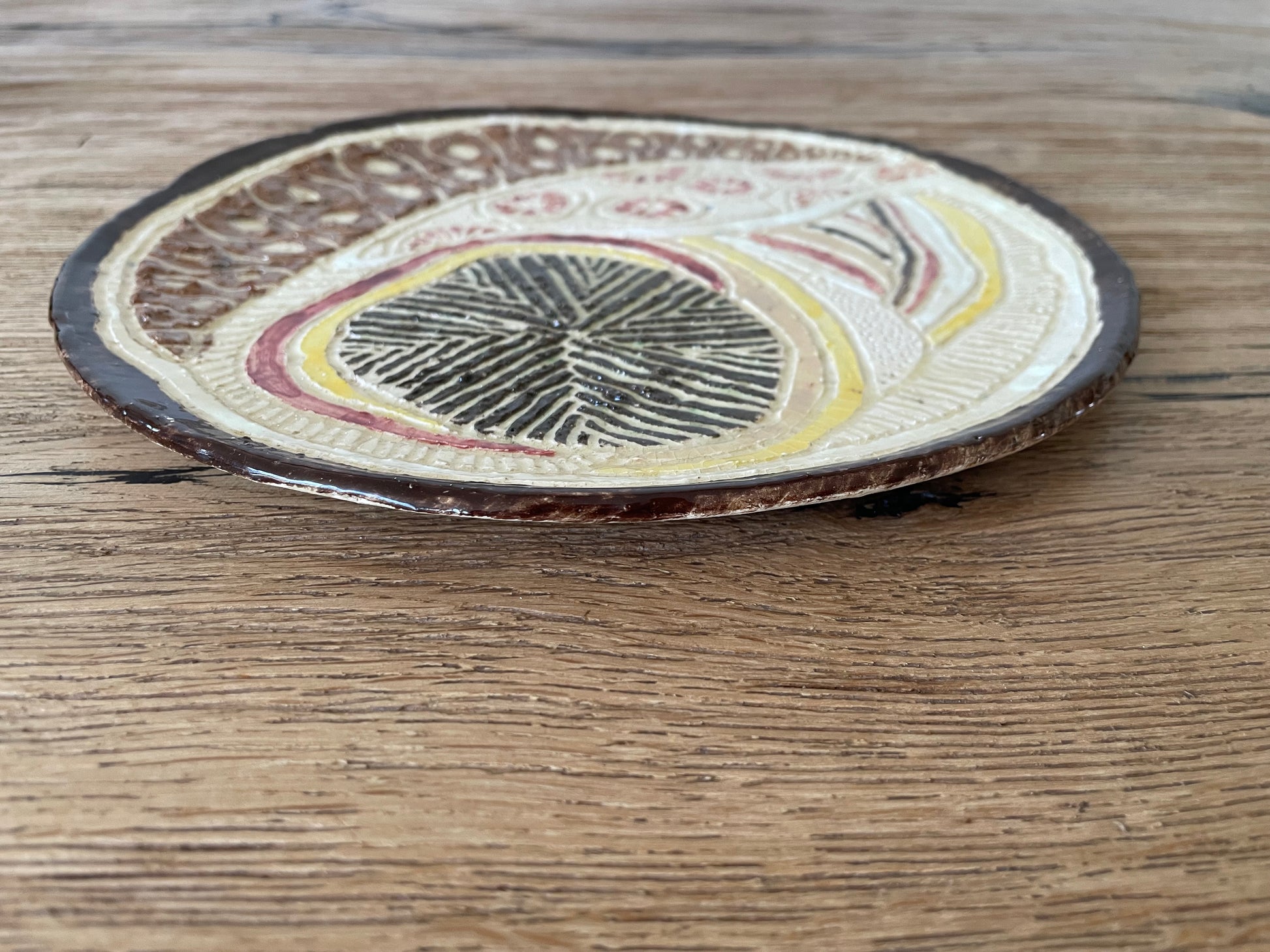 Handgevormd bord van witte klei met reliëf in rode en zwarte klei. Vrije vormen gekrast en gekleurd met rood, bruin, witte en gele onderglazuur. Totaal is geglazuurd met een honingglazuur wat het bord een warme glans geeft.
