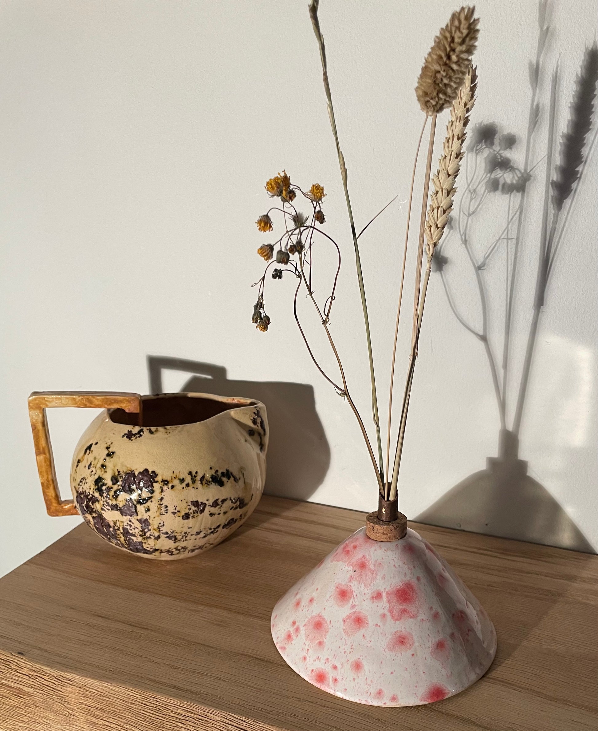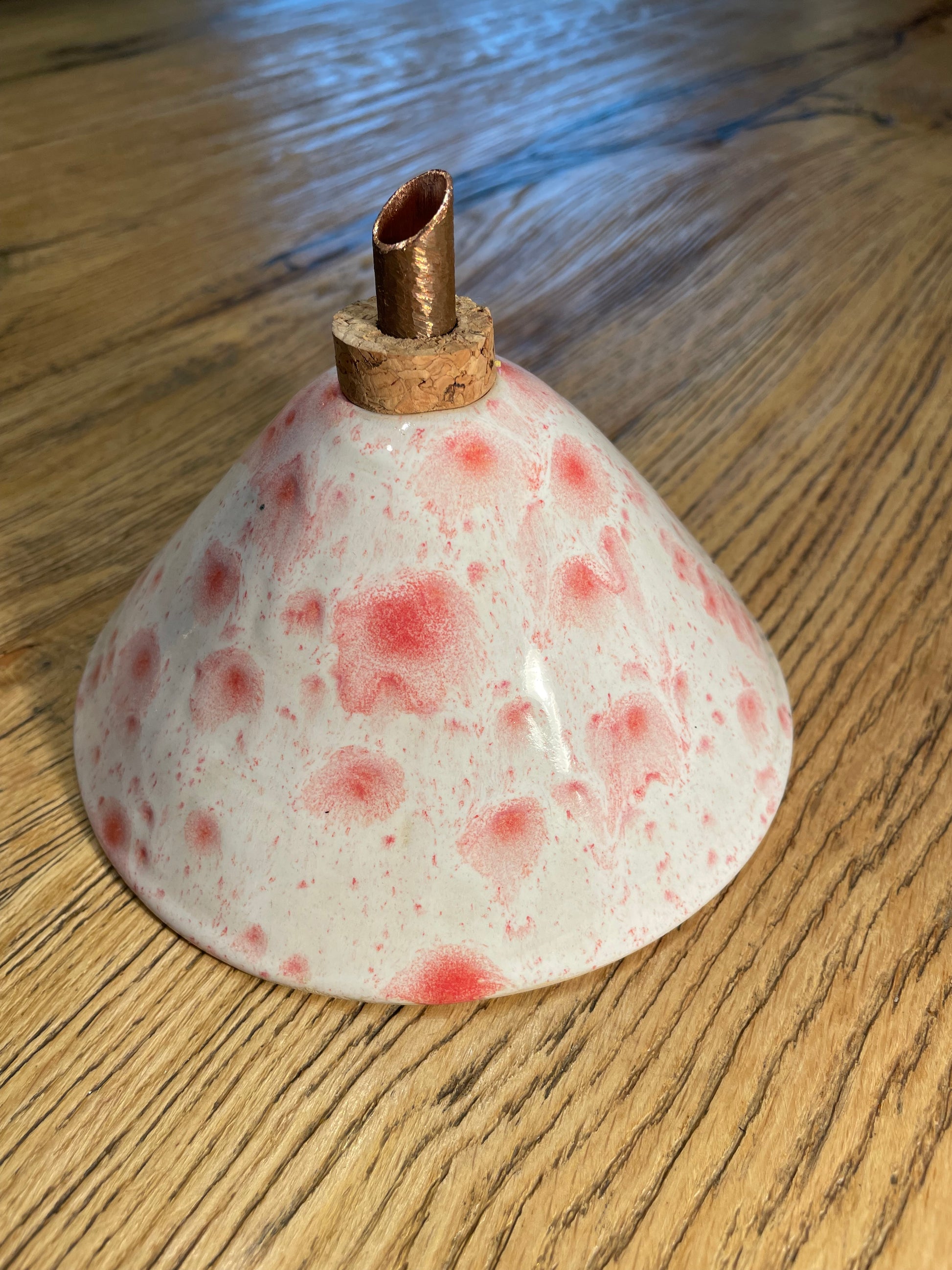 Piramide vaas met kurk en roodkoperen tuit voor droogbloemen, of in combinatie met stokjes als geur diffuser.