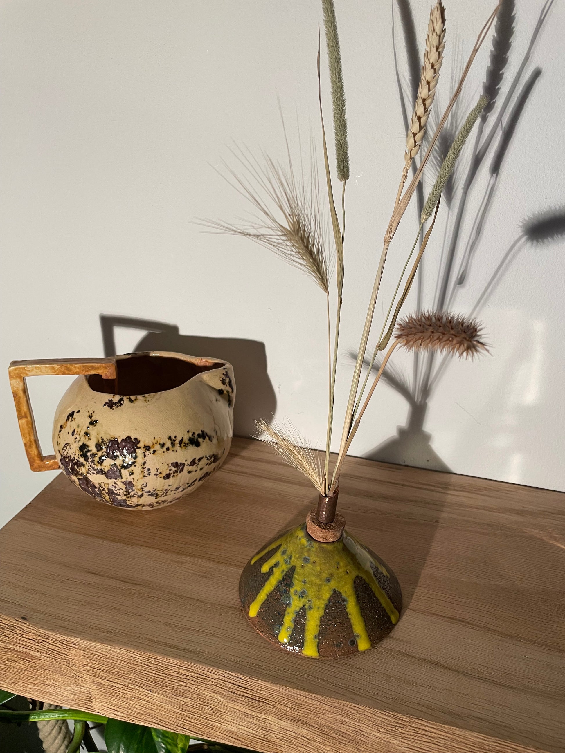 Piramide vaas met kurk en roodkoperen tuit voor droogbloemen, of in combinatie met stokjes als geur diffuser.