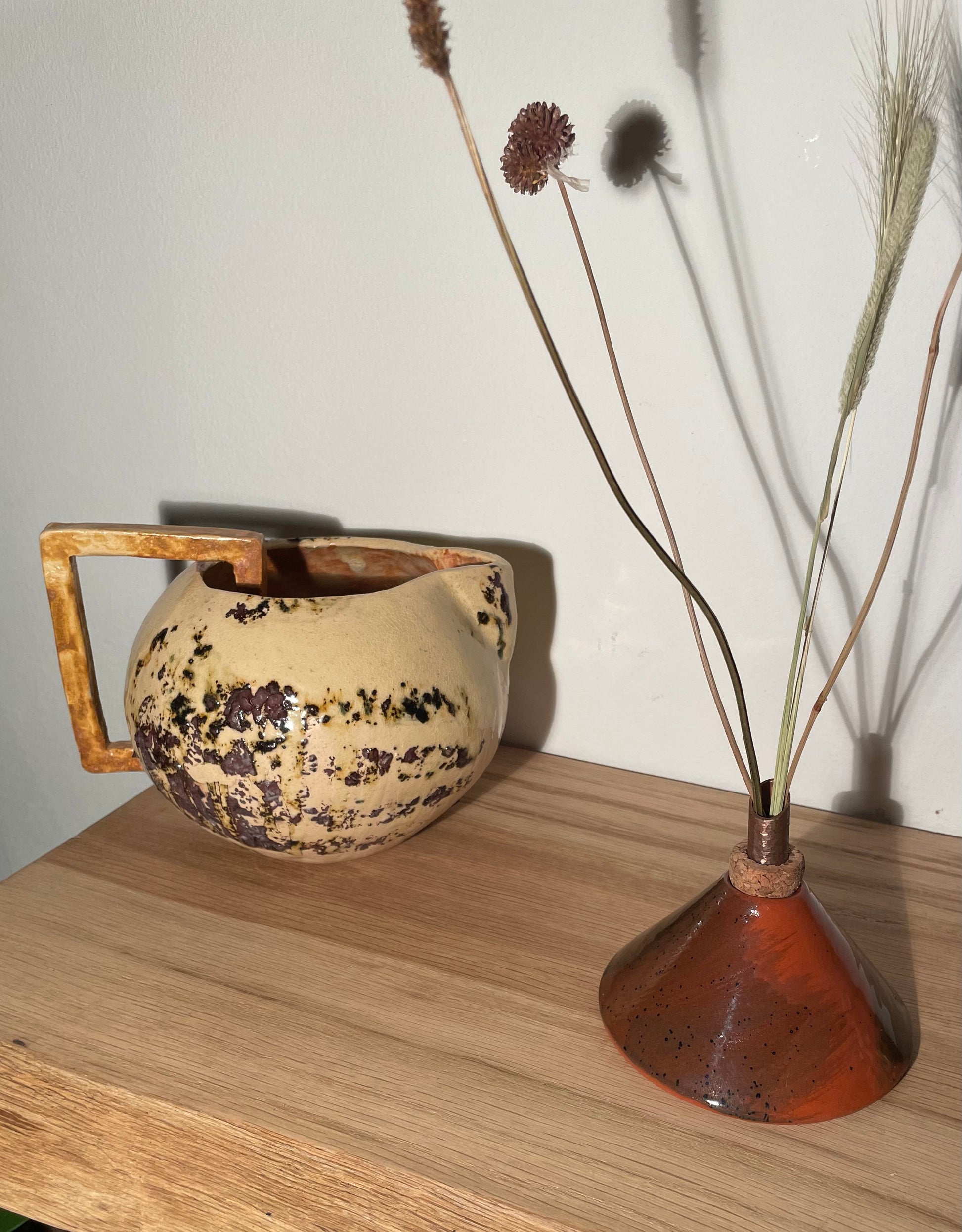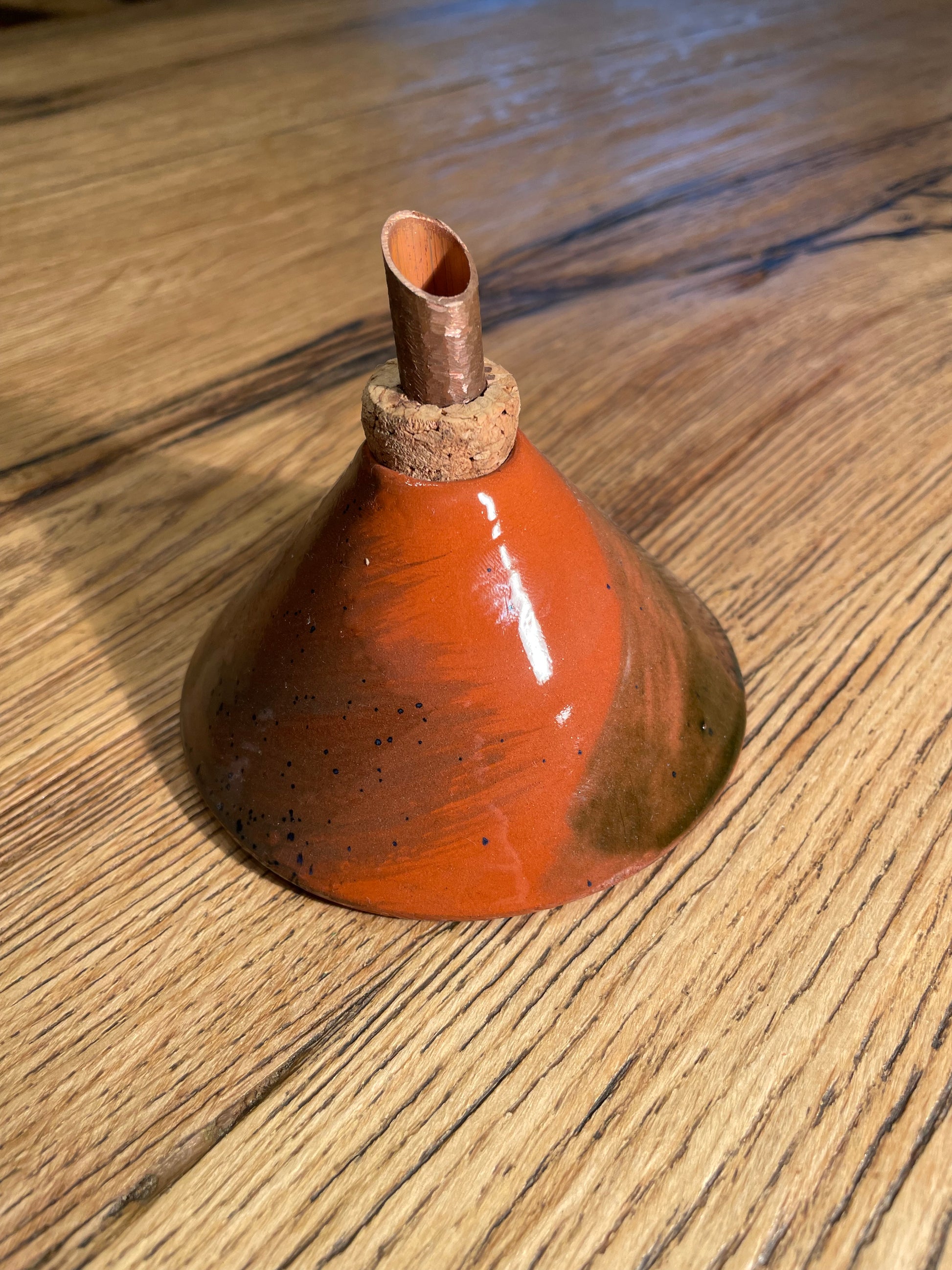 Piramide vaas met kurk en roodkoperen tuit voor droogbloemen, of in combinatie met stokjes als geur diffuser.