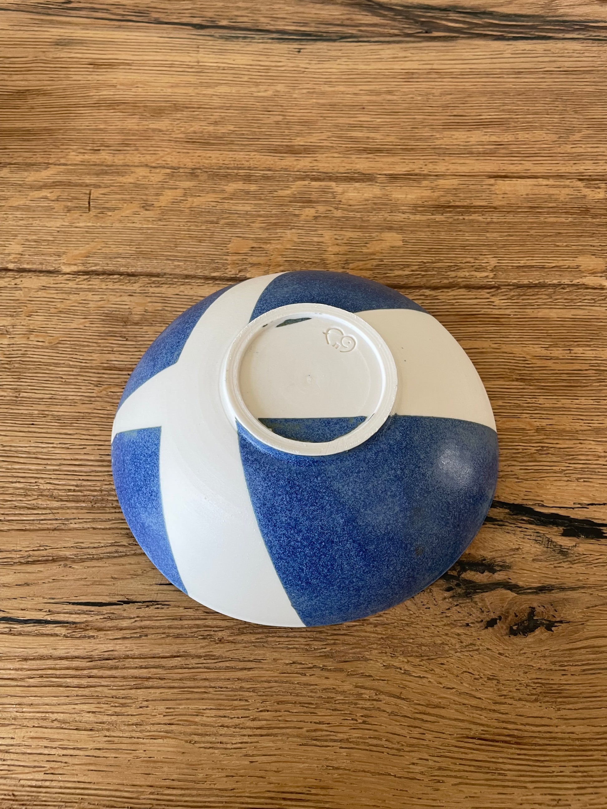Porseleinen schaaltje voorzien van matte blauwe glazuur en aan de onderkant een patroon van (ongeglazuurde) witte lijnen.