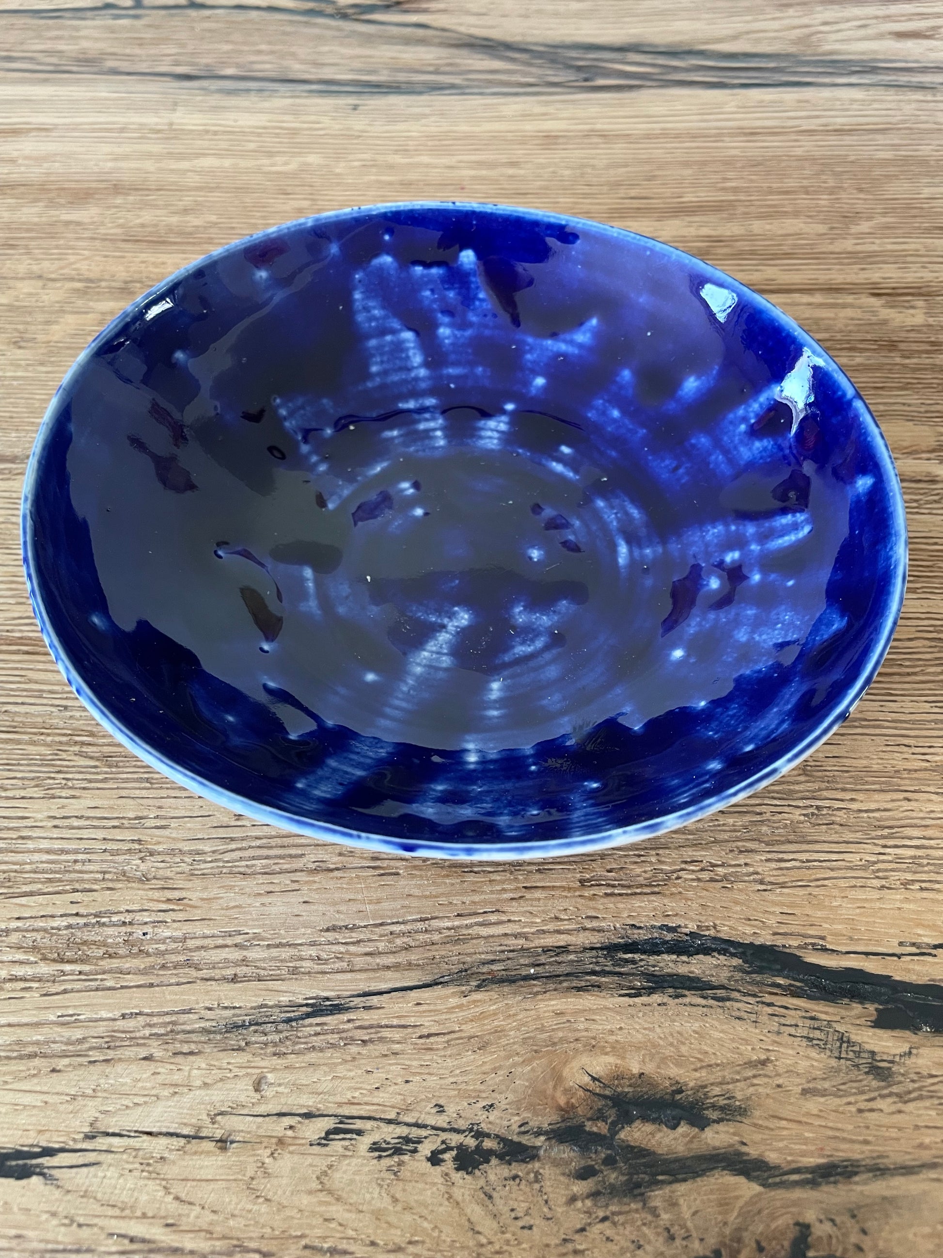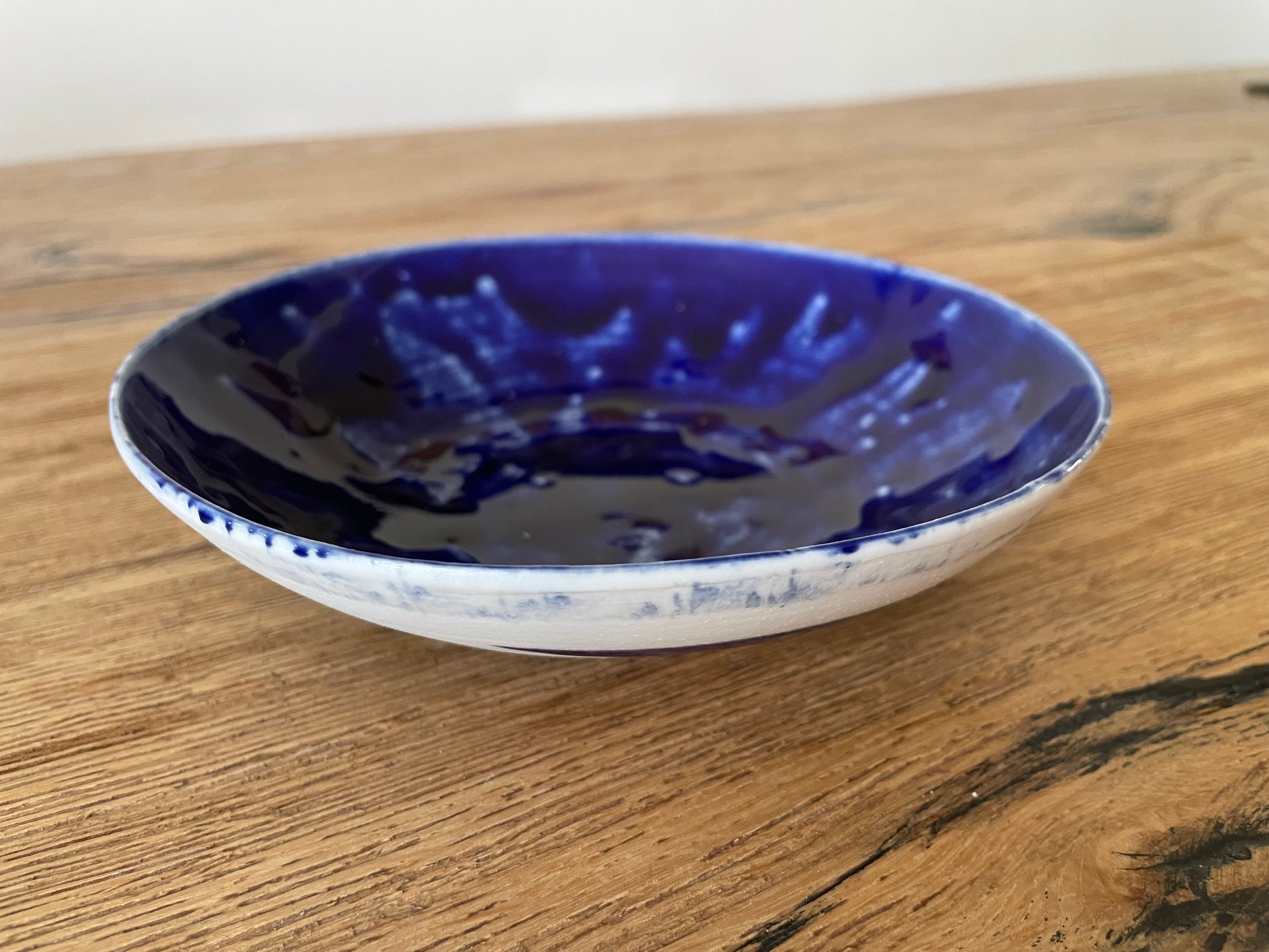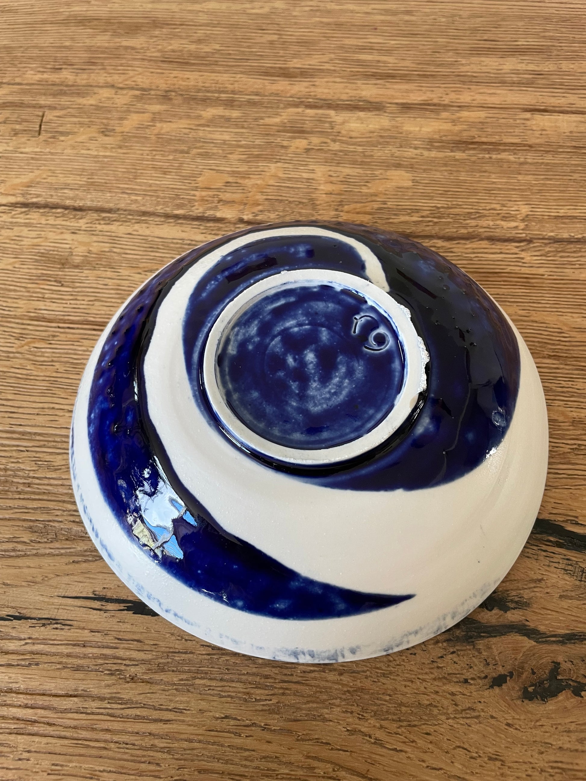 Porseleinen schaaltje voorzien van diep blauwe glazuur en aan de onderkant een patroon van (ongeglazuurde) witte lijn in spiraalvorm.