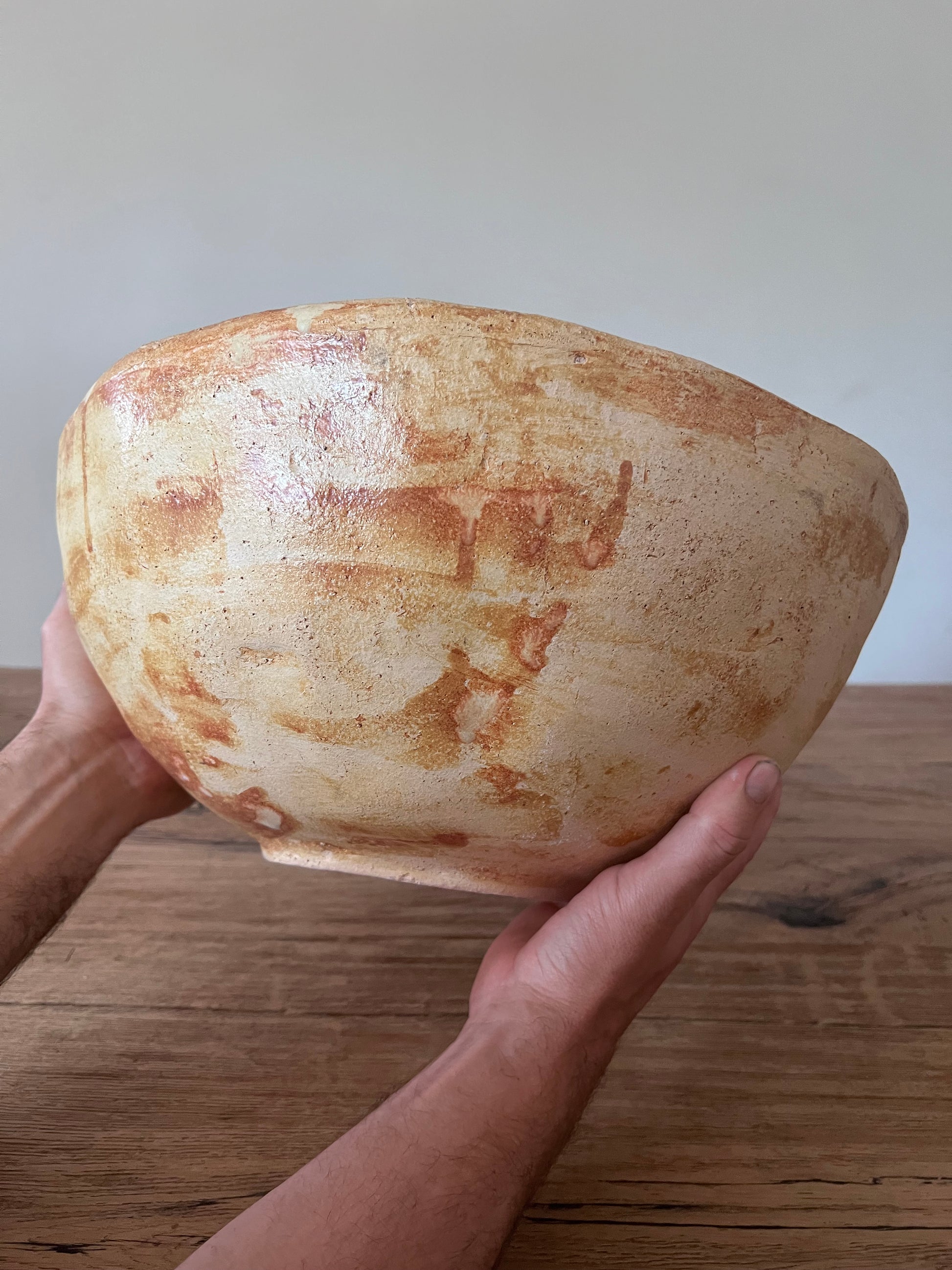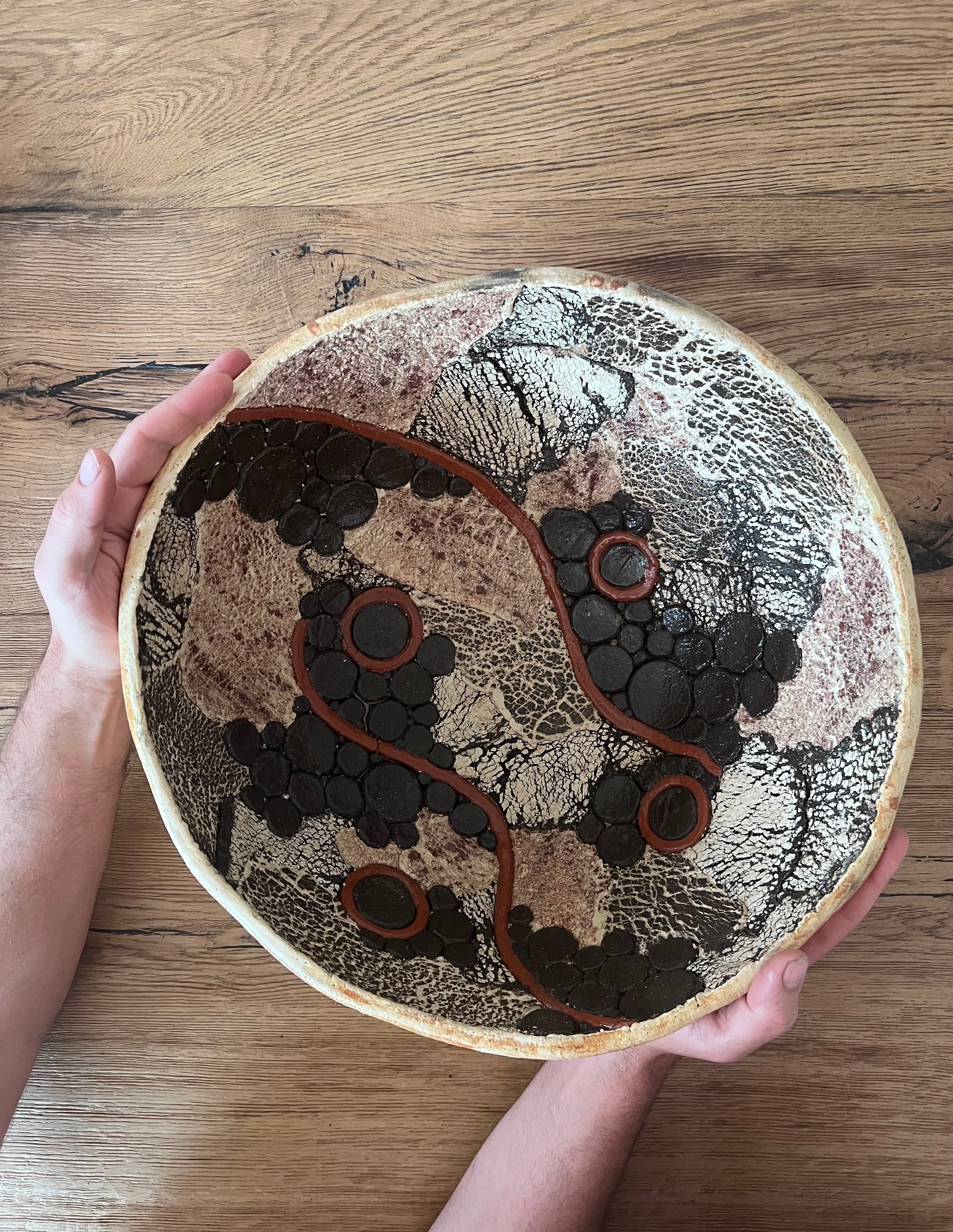 grote handgevormde schaal van verschillende klei soorten, zwarte, terracotta en witte klei. Verschillende vormen, reliëf en craquelé effect. De buitenzijde van de schaal is van witte klei voorzien van een aards terra glazuur.