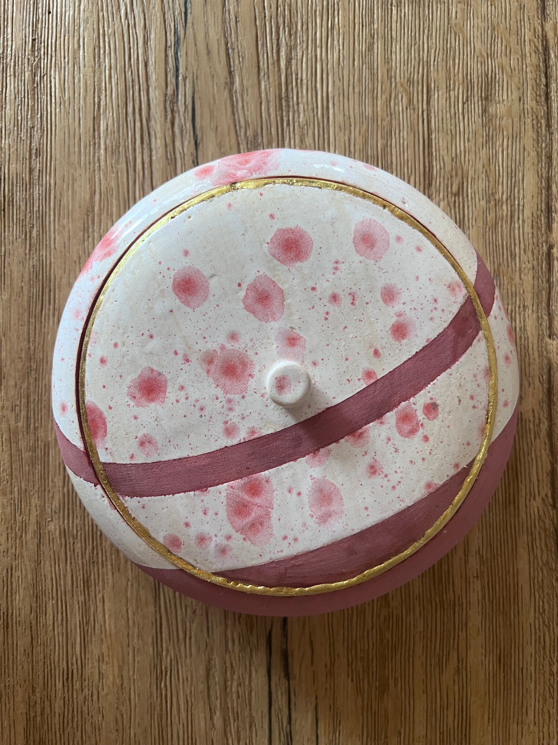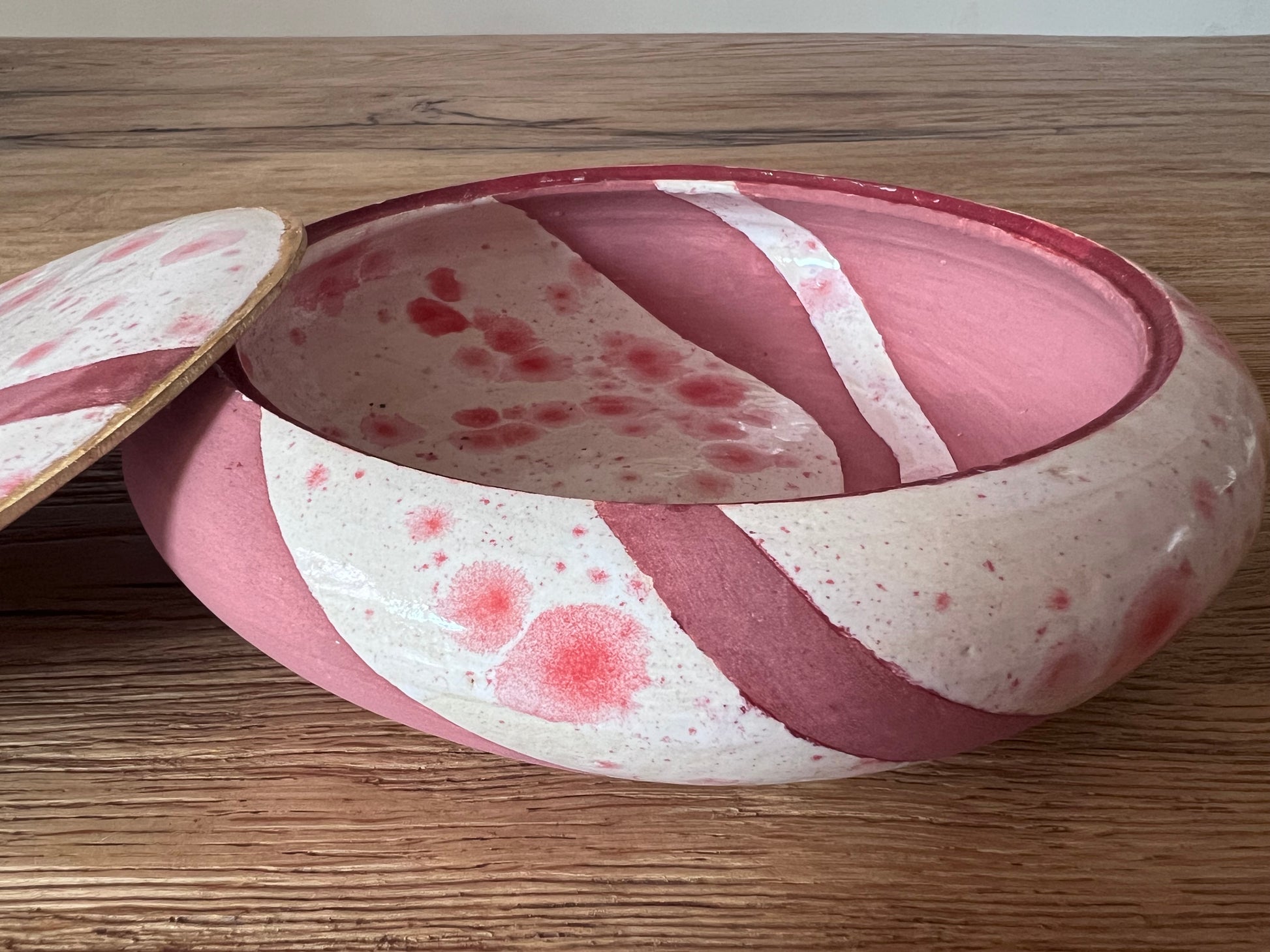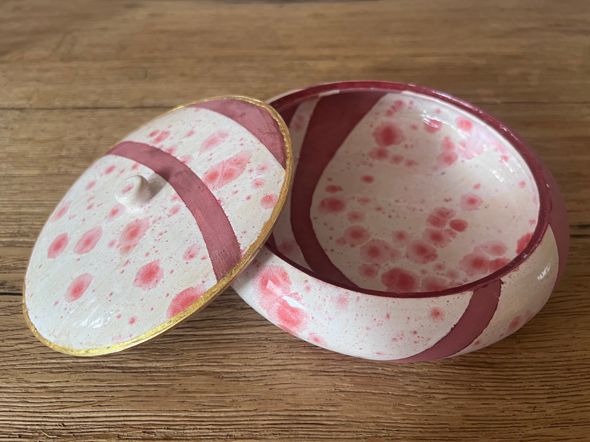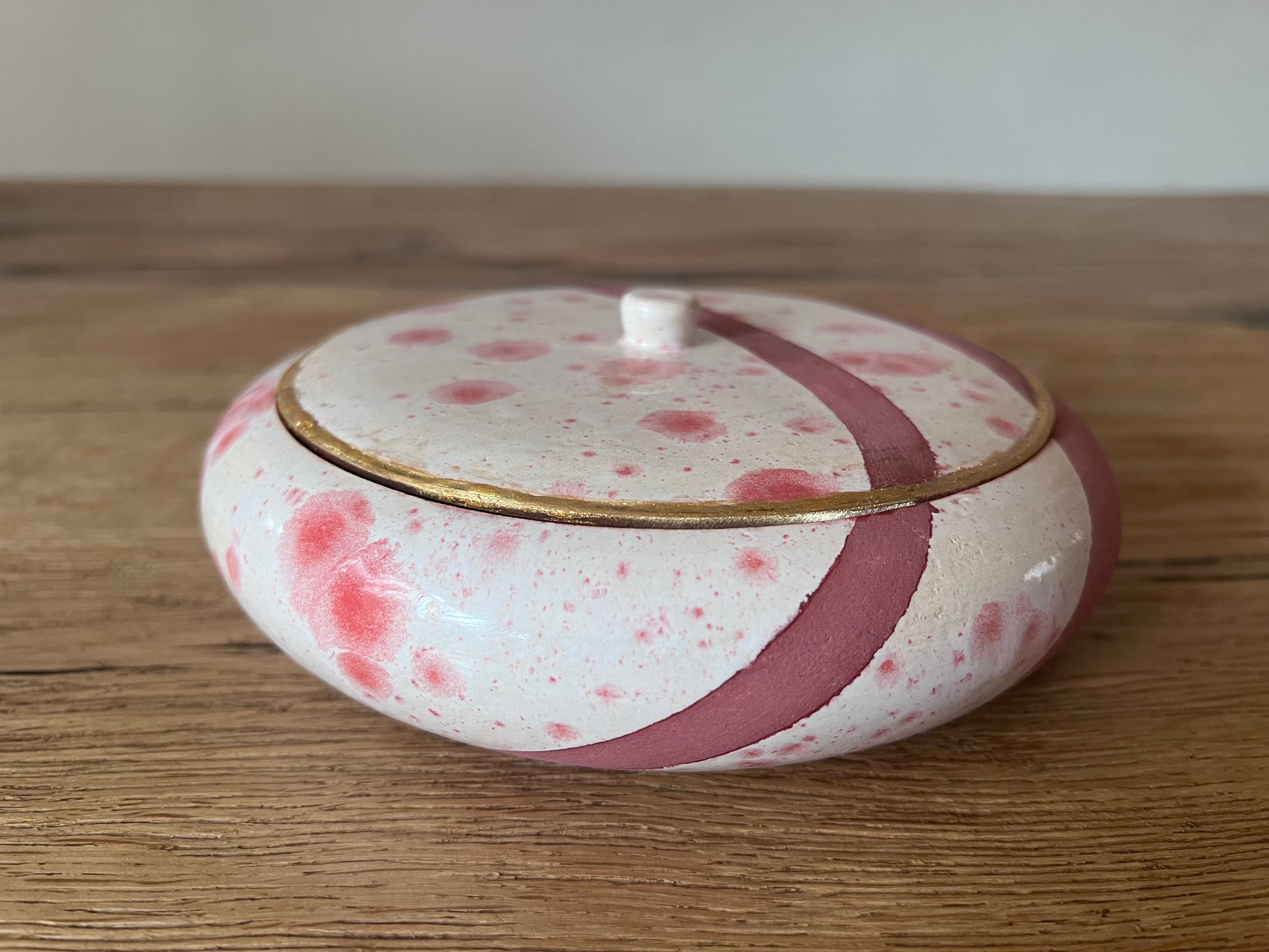 Gedraaide schaal met deksel van witbakkende klei. De schaal is voorzien van wit roze effect glazuur en een patroon van matte rode glazuur. Daarnaast heeft de deksel een gouden messing buitenrand.