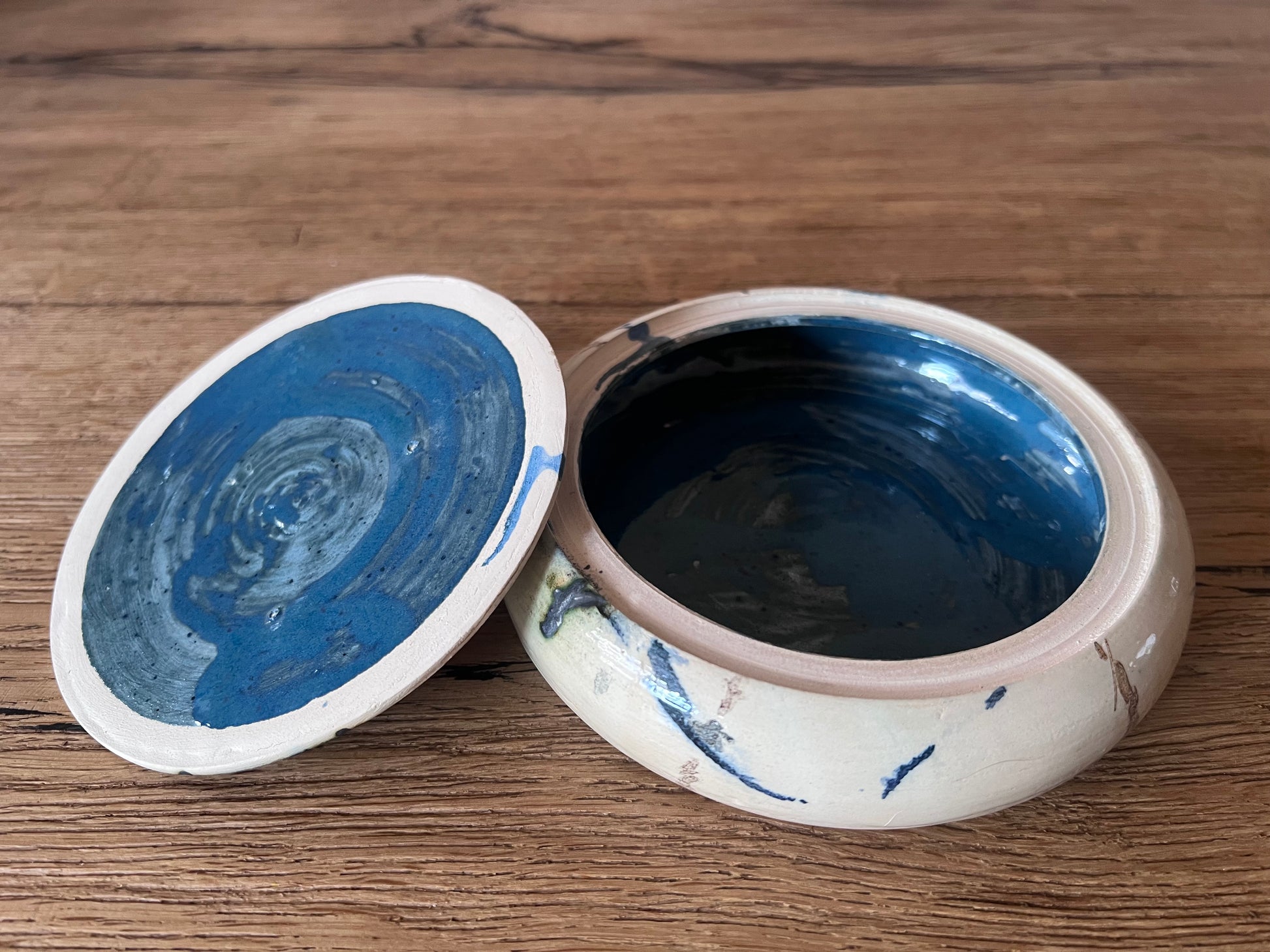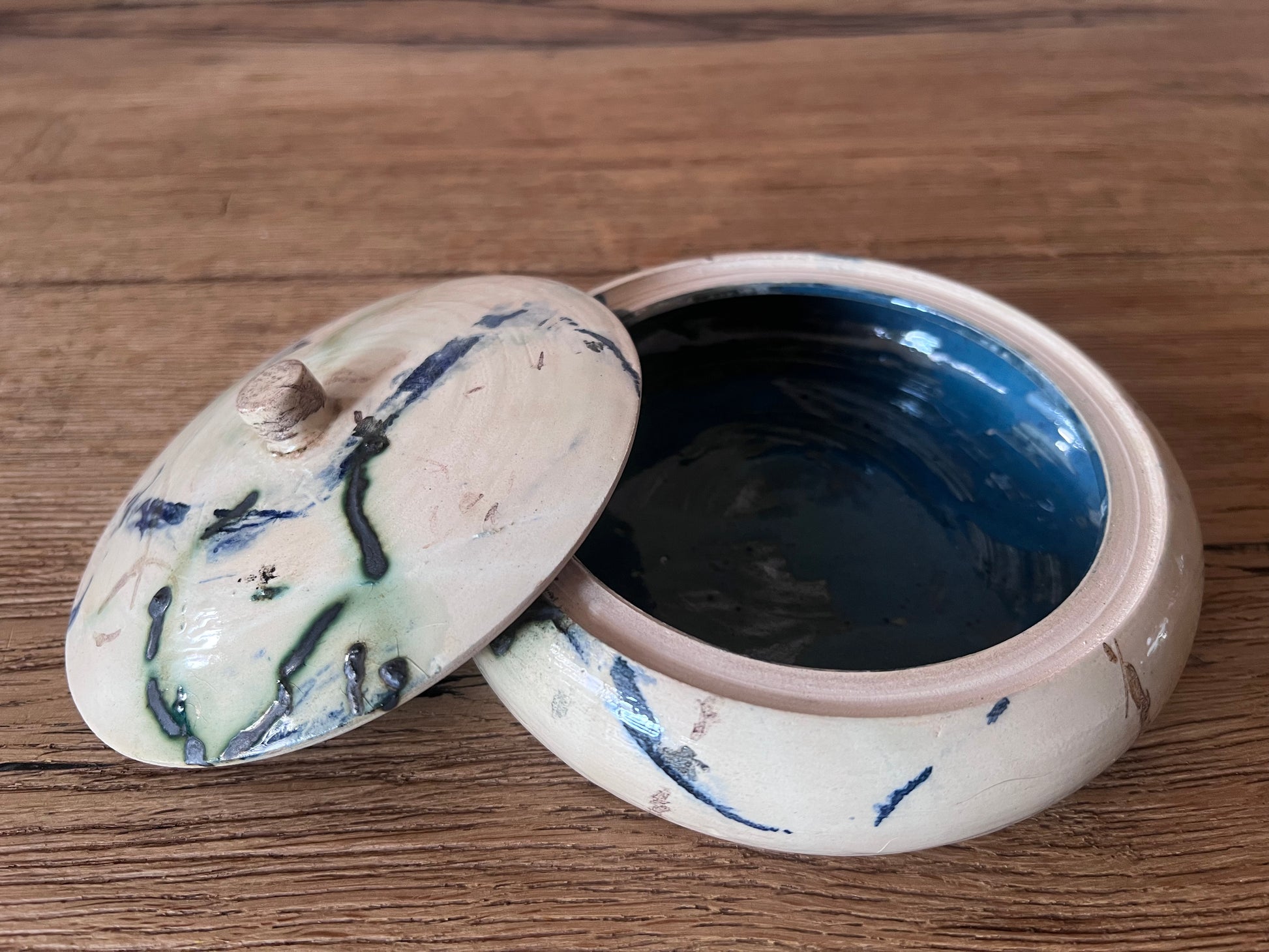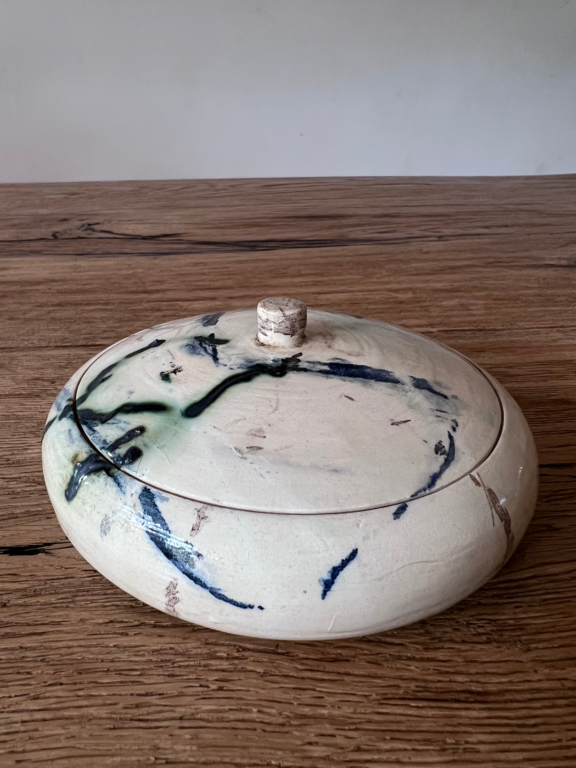 gedraaide schaal met deksel van witbakkende klei. Gekleurd met sagar techniek waarbij de kleuren gecreëerd worden door oxides en metalen toe te voegen die verbranden in de oven en daardoor ingebakken worden in de klei.