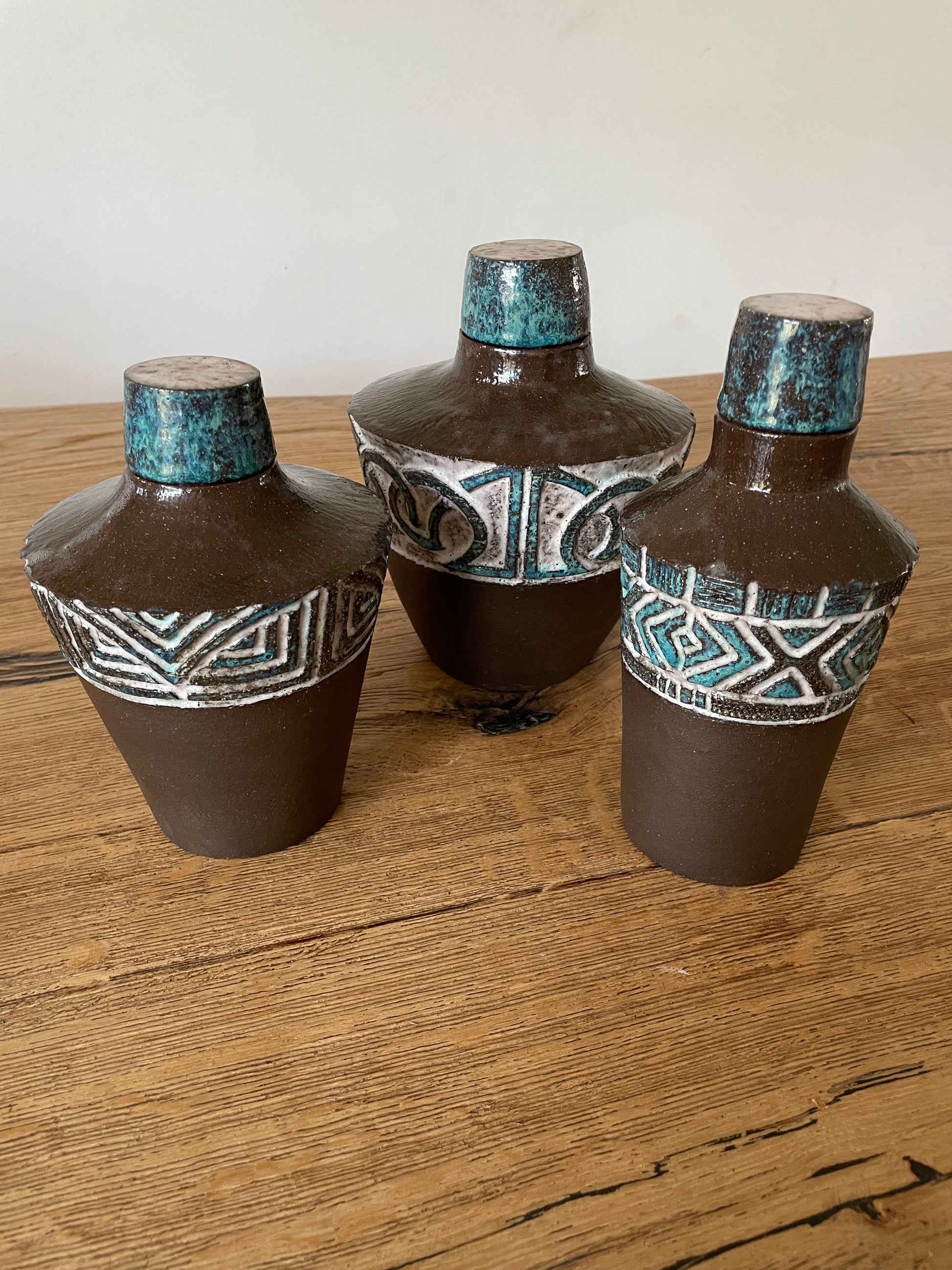 Gedraaide vazen van zwarte klei met dop. Voor deze serie heb ik me laten inspireren door oude beschavingen, de vorm van de vazen is gebaseerd op Griekse amfora’s en het reliëf op Afrikaanse, Keltische en Azteekse vormen en tekeningen. Ik heb gebruik gemaakt van twee glazuren en de onderkant van de vazen zijn gepolijst en ongeglazuurd.