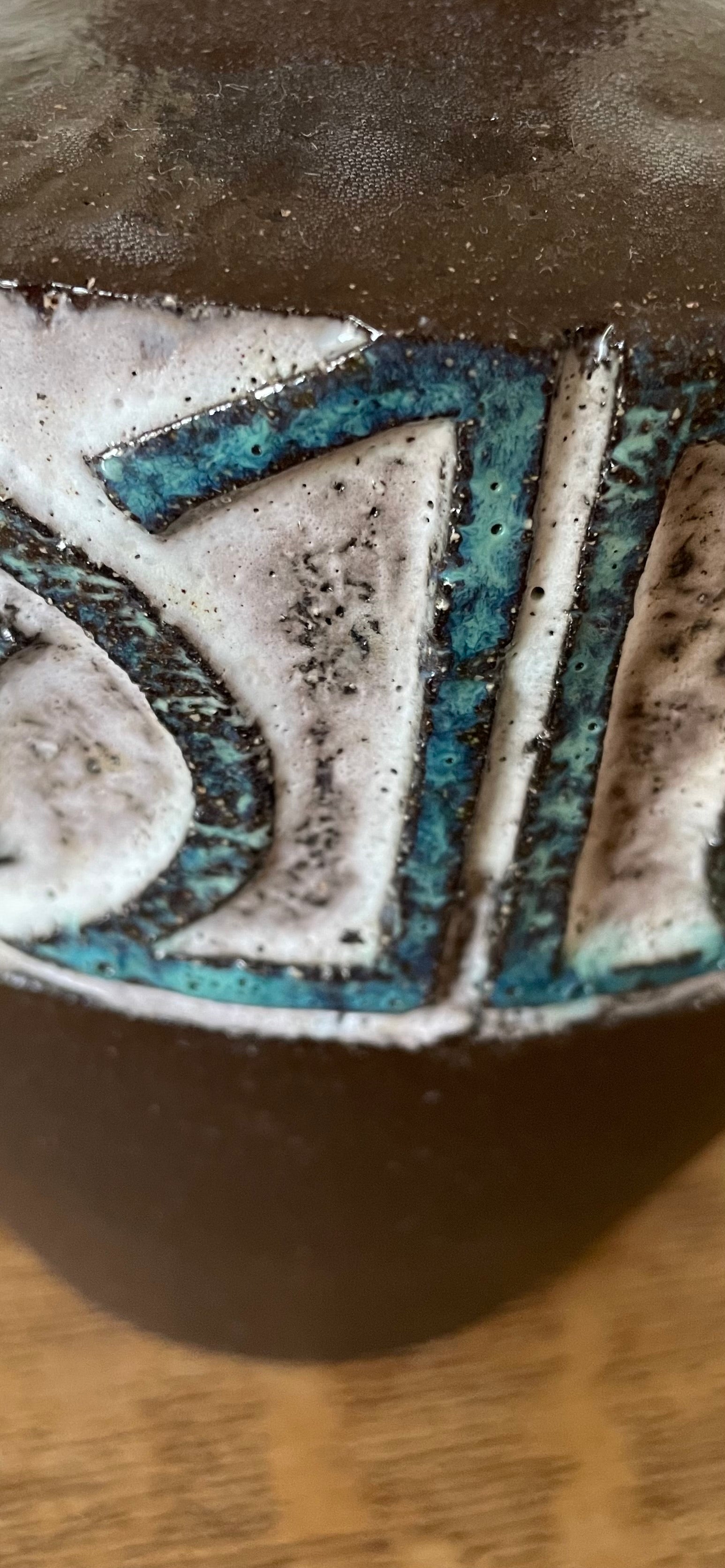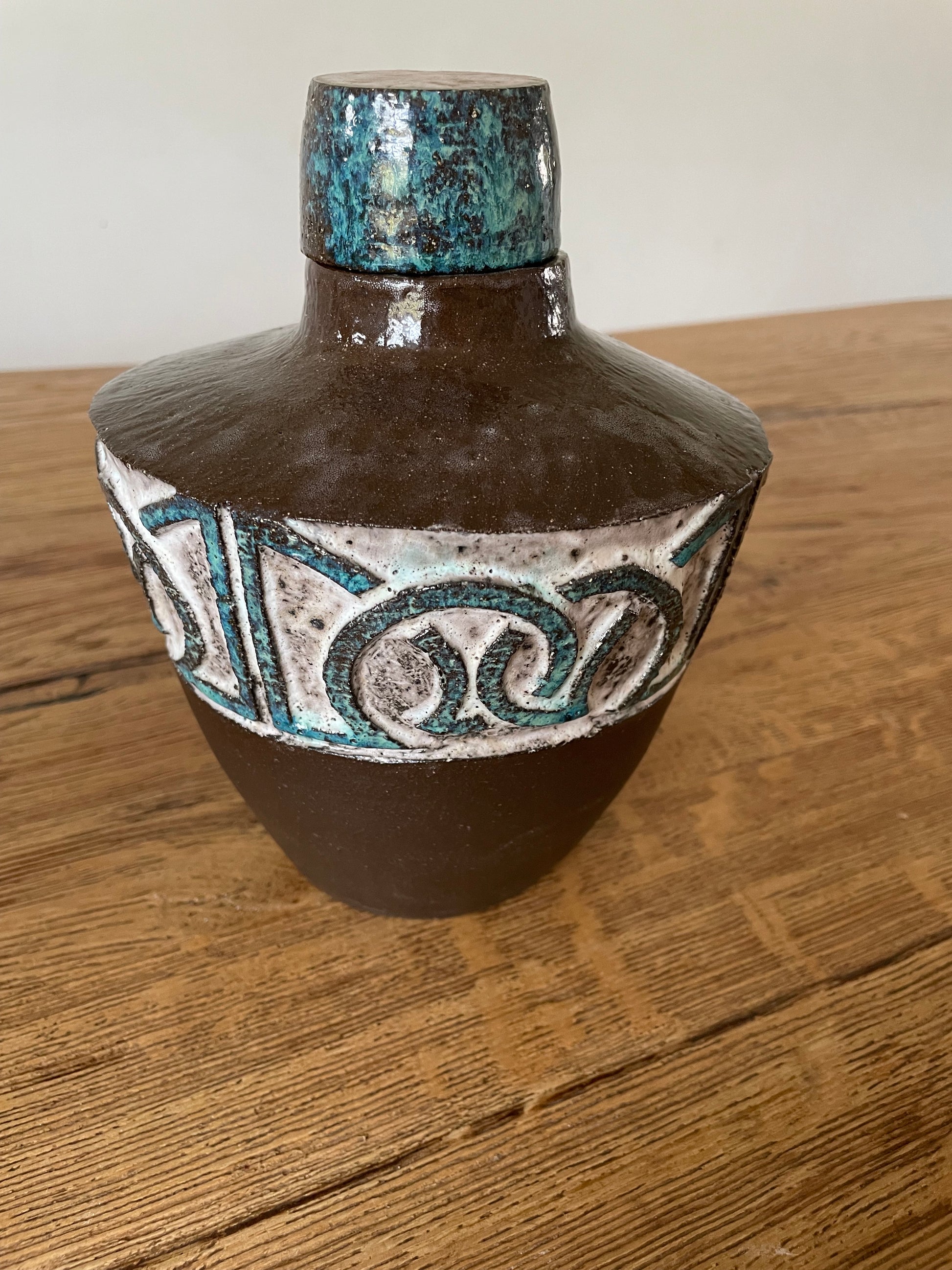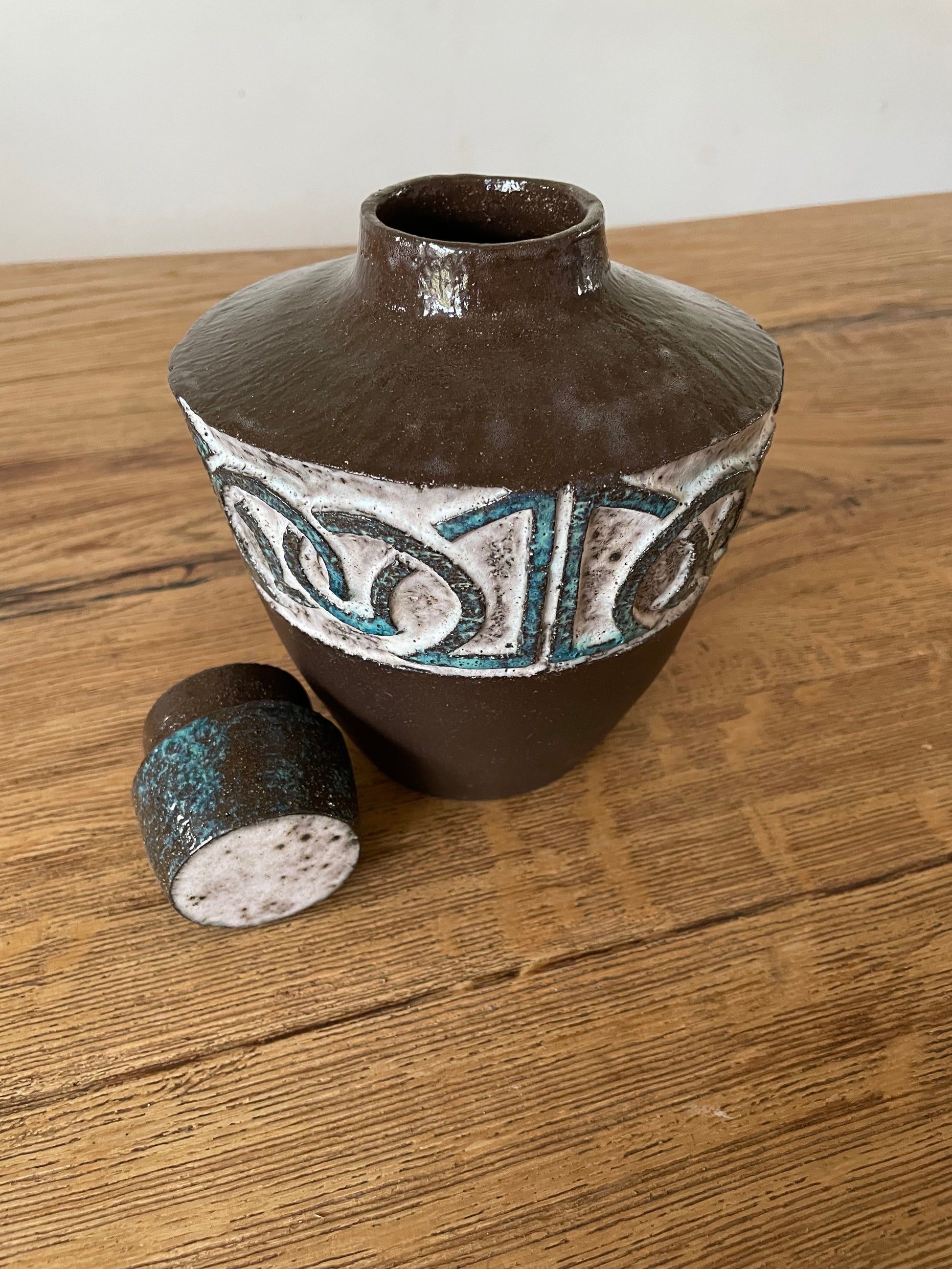 Gedraaide vaas van zwarte klei met dop. De vaas komt uit een serie waarin ik me heb laten inspireren door oude beschavingen, de vorm van de vaas is gebaseerd op amfora’s en het reliëf op Keltische lijnen. Ik heb gebruik gemaakt van twee glazuren en de onderkant van de vaas is gepolijst en ongeglazuurd. De vaas is los te koop maar ook als set (wanneer voorradig).