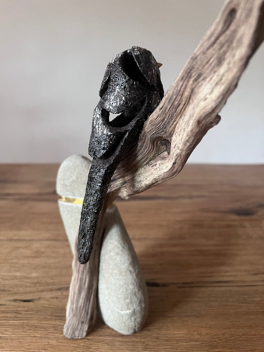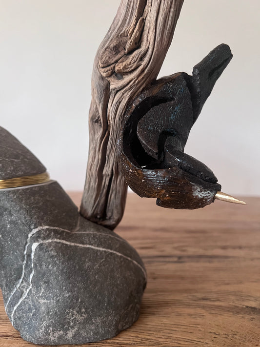 Staartmees op hout met messing en steen